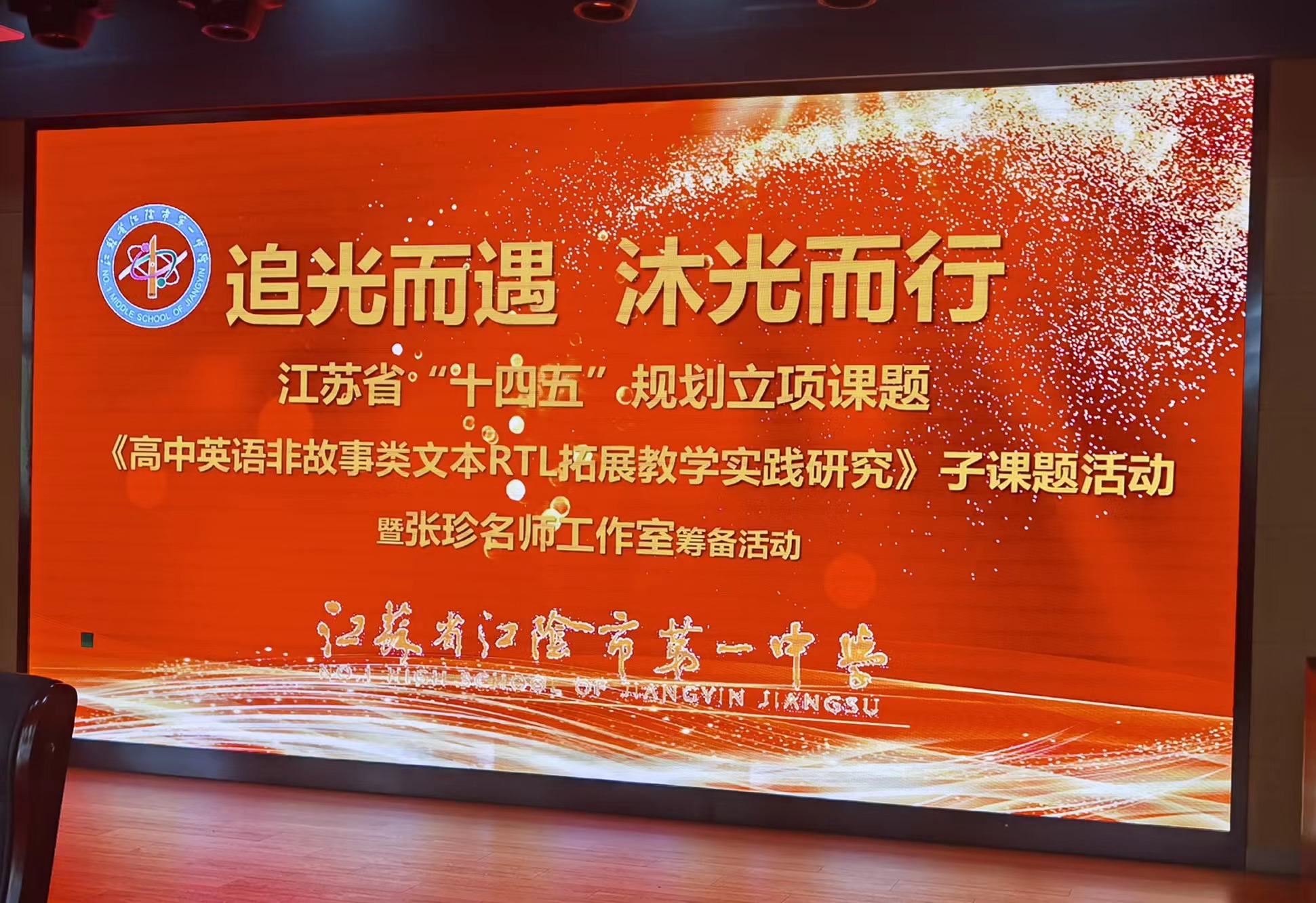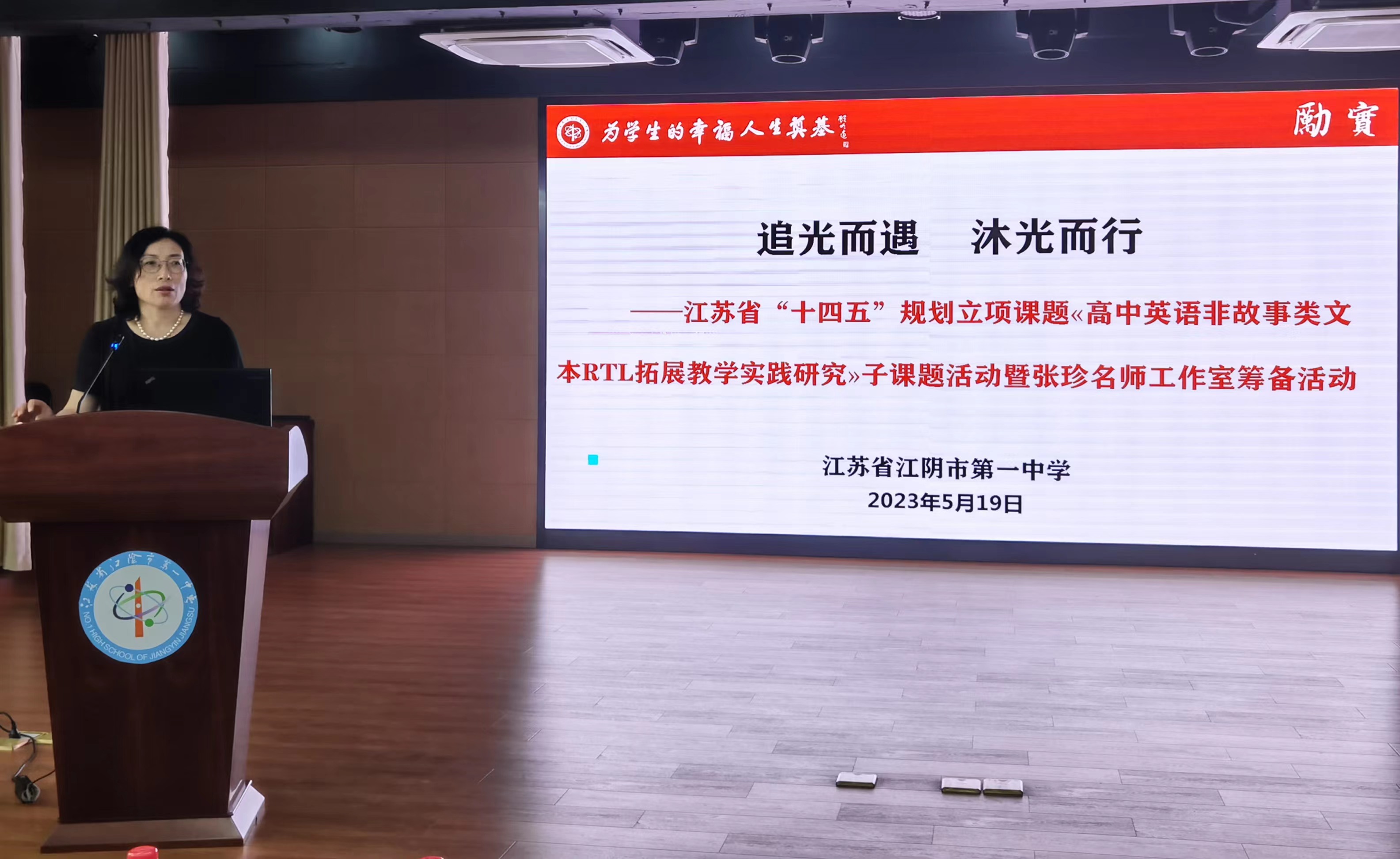 2023年5月19日下午,我校英语组在辅实楼二楼报告厅隆重举行“追光而遇 沐光而行”——江苏省“十四五”规划立项课题《高中英语非故事类文本RTL拓展教学实践研究》子课题活动暨张珍名师工作室筹备活动。中国出版集团美国公司出版总监魏令查教授受邀来校讲座,校党委副书记何伟忠同志出席本次活动并作重要讲话,各兄弟学校也派员参加了本次活动。