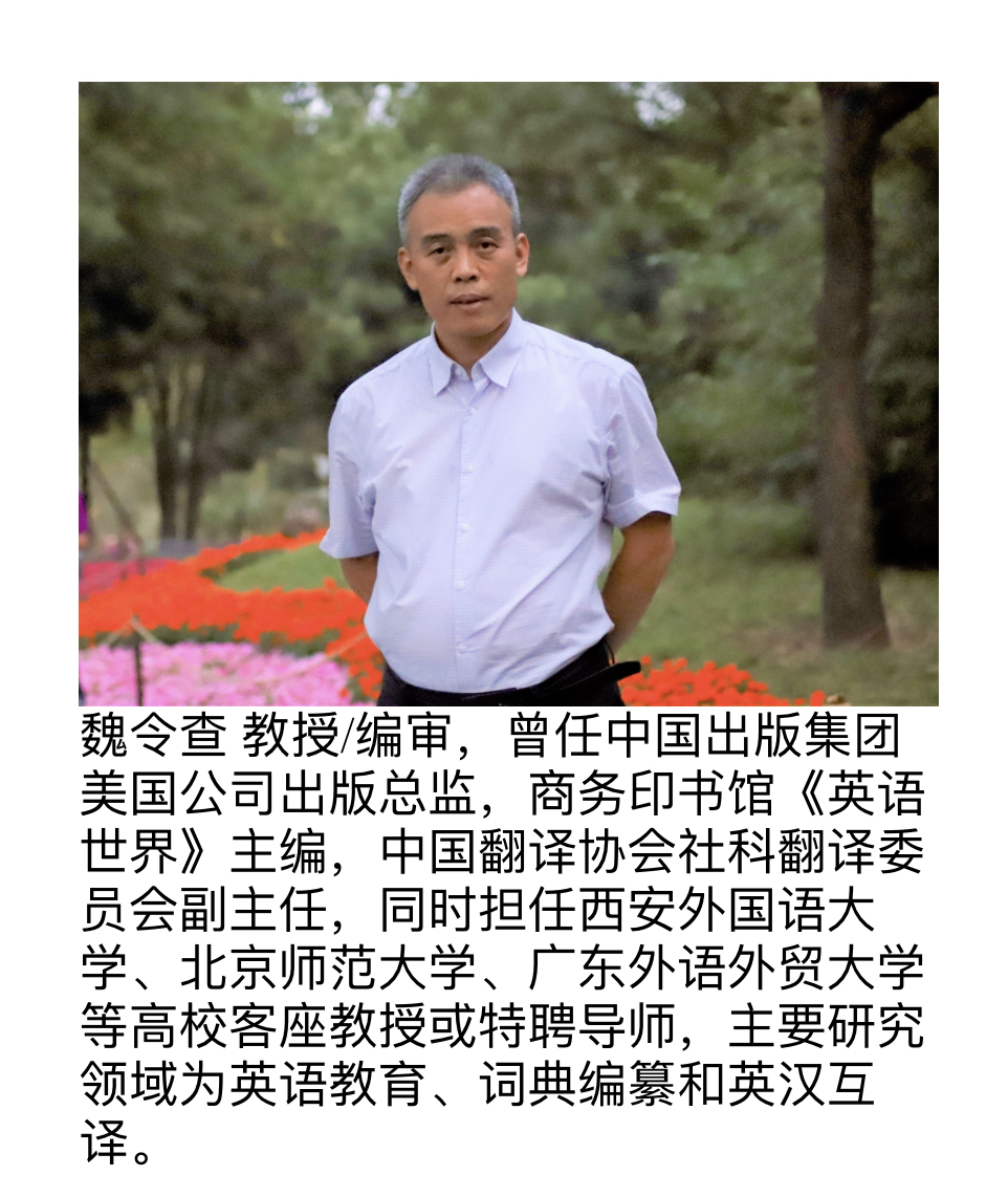 魏令查教授/编审,曾任中国出版集团美国公司出版总监,商务印书馆《英语世界》主编,中国翻译协会社科翻译委员会副主任,同时担任西安外国语大学,北京师范大学,广东外语外贸大学等高校客座教授或特聘导师,主要研究领域为英语教育,词典编纂和英汉互译。