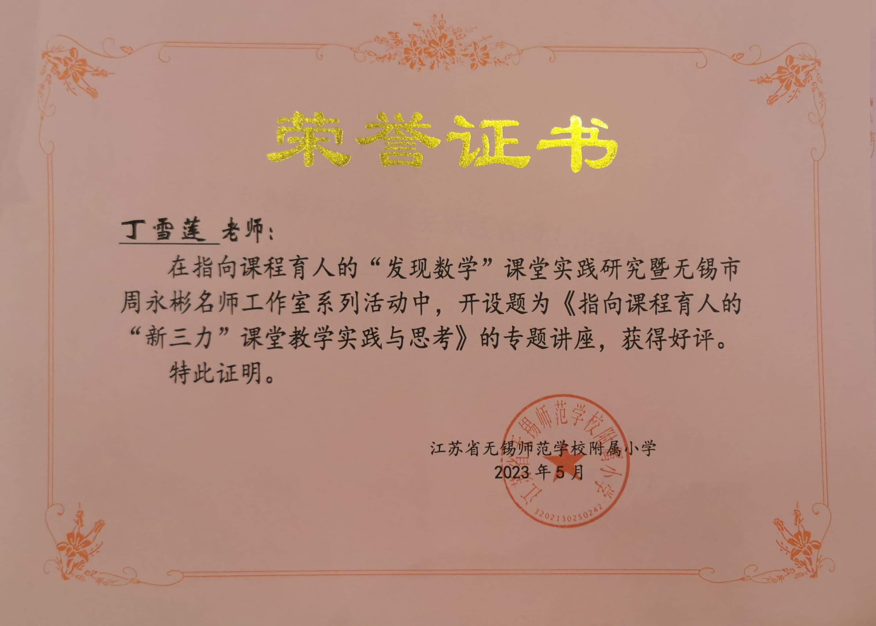 丁雪莲在指向课程育人的“发现数学”课堂实践研究暨无锡市周永彬名师工作室系列活动中,开设题为《指向课程育人的“新三力”课堂教学实践与思考》的专题讲座,获得好评。
