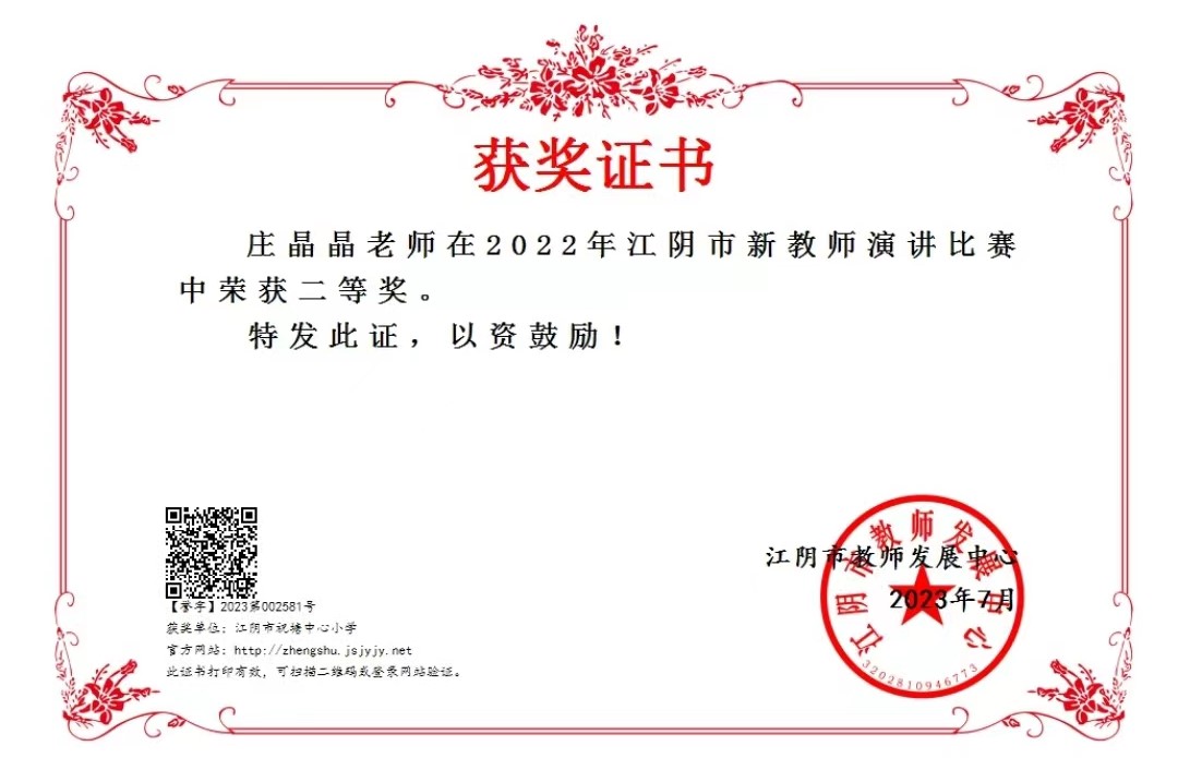 网站类目:学科比赛情况 姓名:庄晶晶 所在单位:江阴市祝塘中心小学 获奖类别:新教师演讲比赛 获奖级别:县级 获奖等级: 获奖时间:2023-07-01 评比部门:教师发展中心 发表刊物: 刊物级别:国家级 发表时间:2023-09-26