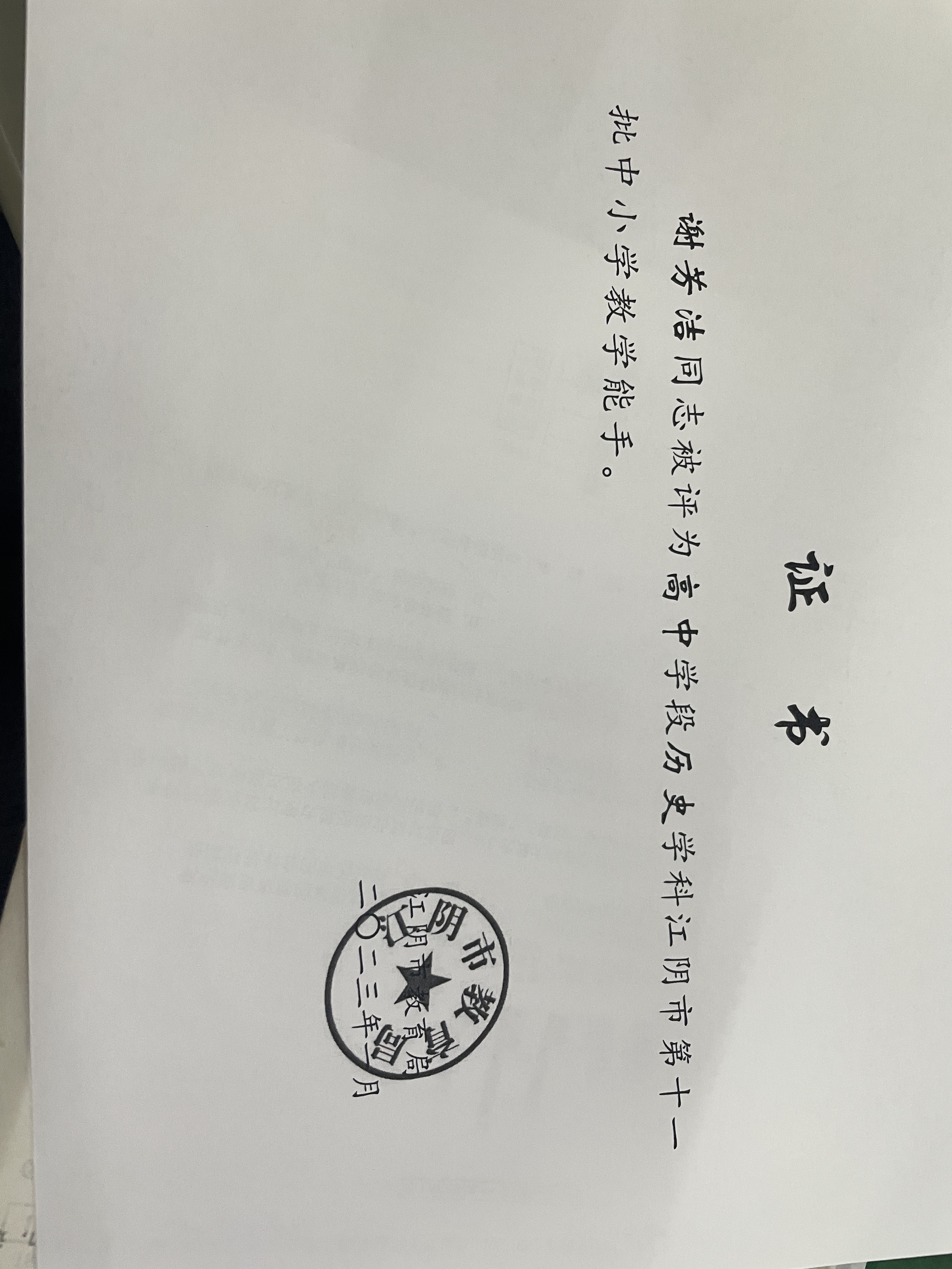 2023年获得江阴市高中学段历史学科第十一批中小学教学能手