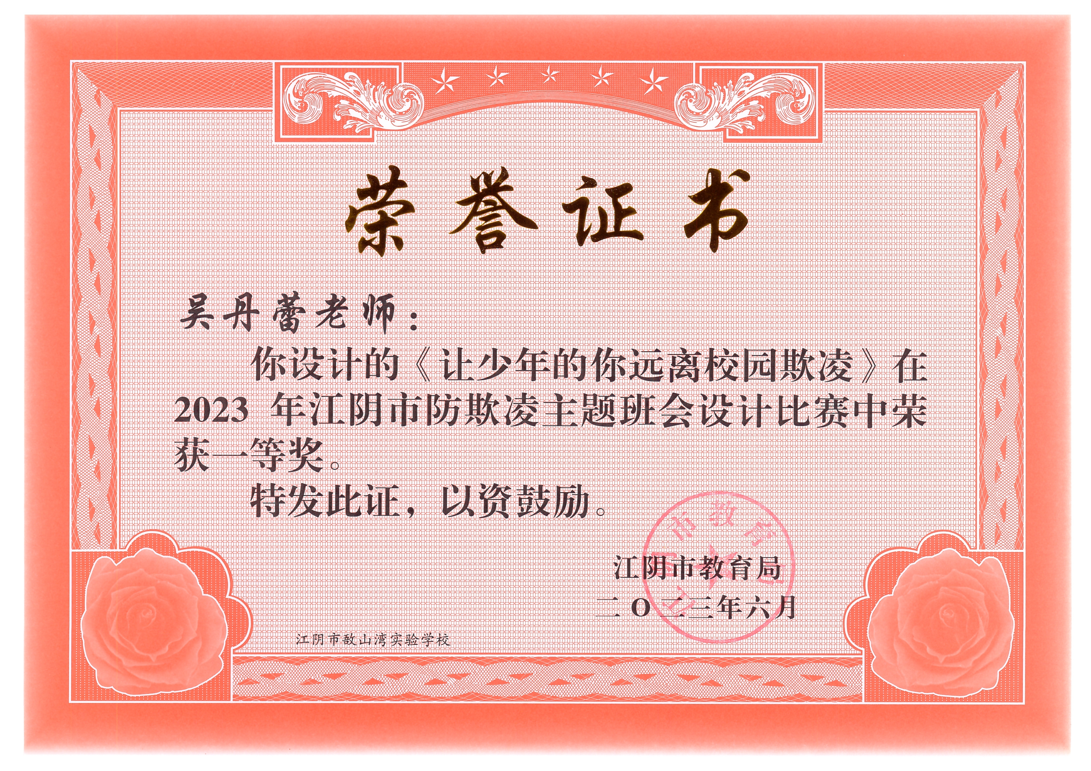 吴丹蕾老师防欺凌班会设计获江阴市一等奖
