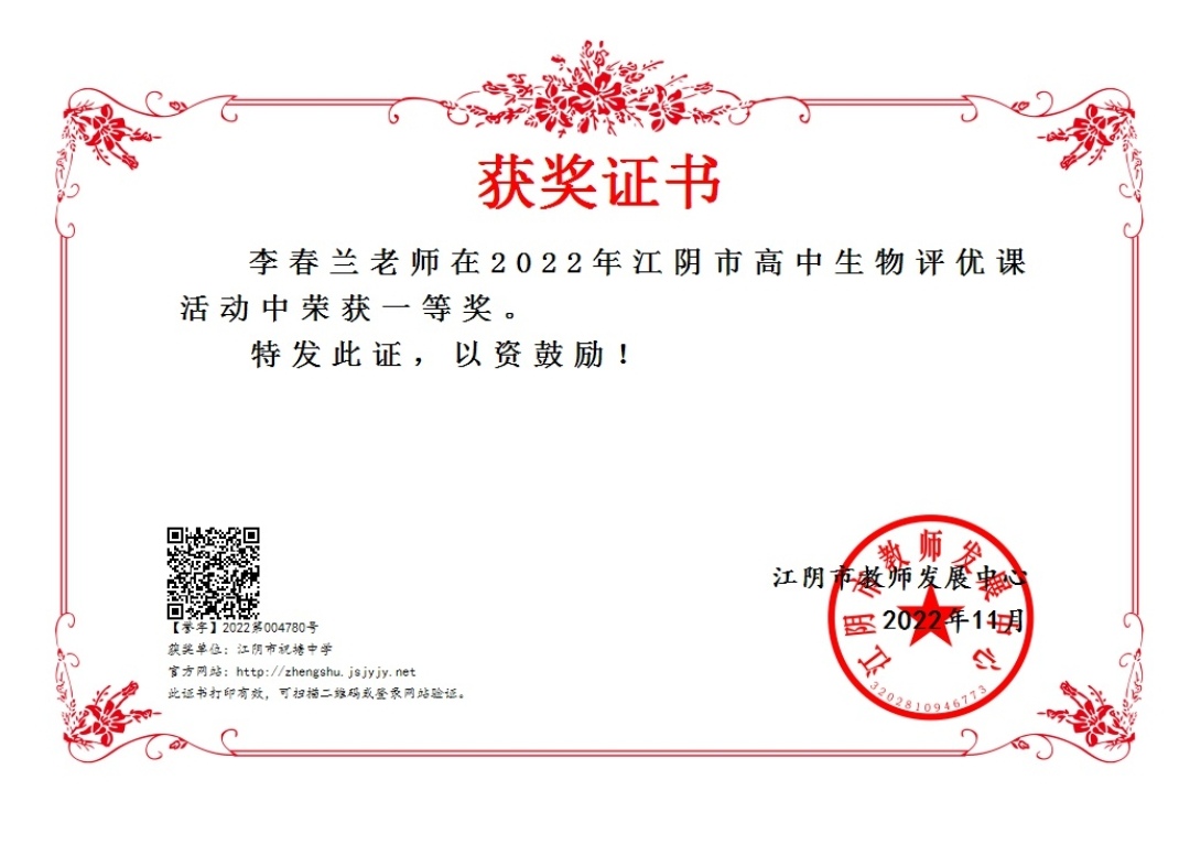 网站类目:学科比赛情况 姓名:李春兰 所在单位:江阴市教育局 获奖类别:江阴市生物评优课 获奖级别:县级 获奖等级: 获奖时间:2022-11-20 评比部门:江阴市教师发展中心 发表刊物: 刊物级别:国家级 发表时间:2023-10-05