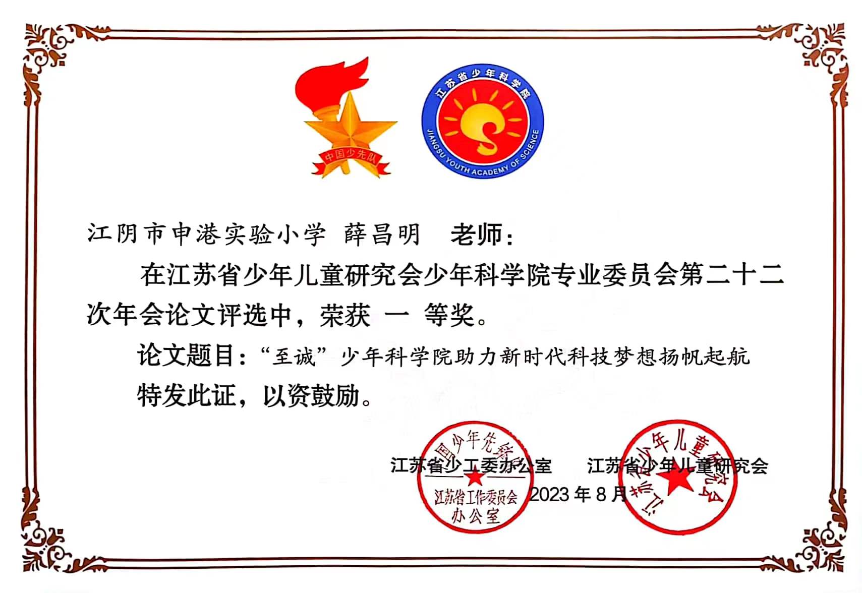 薛昌明老师在江苏省少年儿童研究会少年科学院专业委员会第二十二次年会论文评选获一等奖