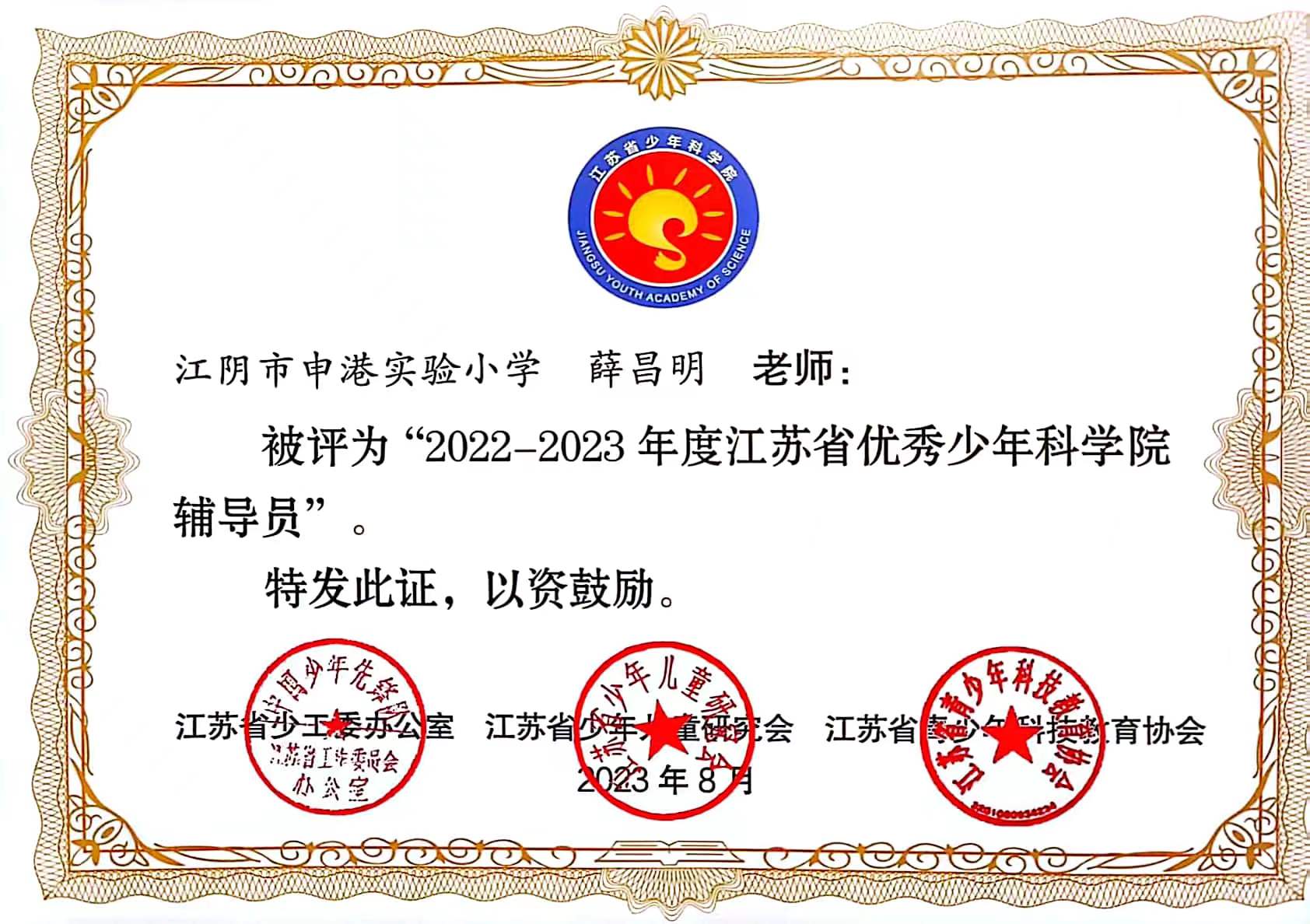 薛昌明老师被评为“2022-2023年度江苏省优秀少年科学院辅导员”