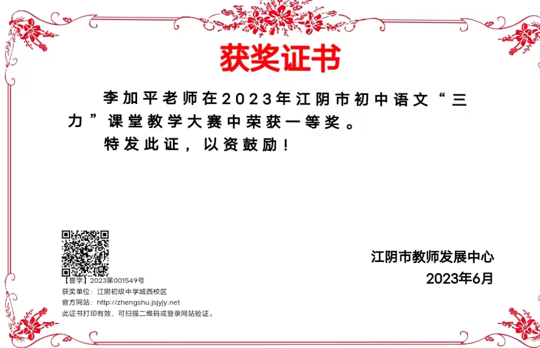 网站类目:学科比赛情况 姓名:李加平 所在单位:江阴实验中学 获奖类别:三力课堂教学大赛 获奖级别:市级 获奖等级: 获奖时间:2023-06-01 评比部门:江阴市教师发展中心 发表刊物: 刊物级别:国家级 发表时间:0000-00-00