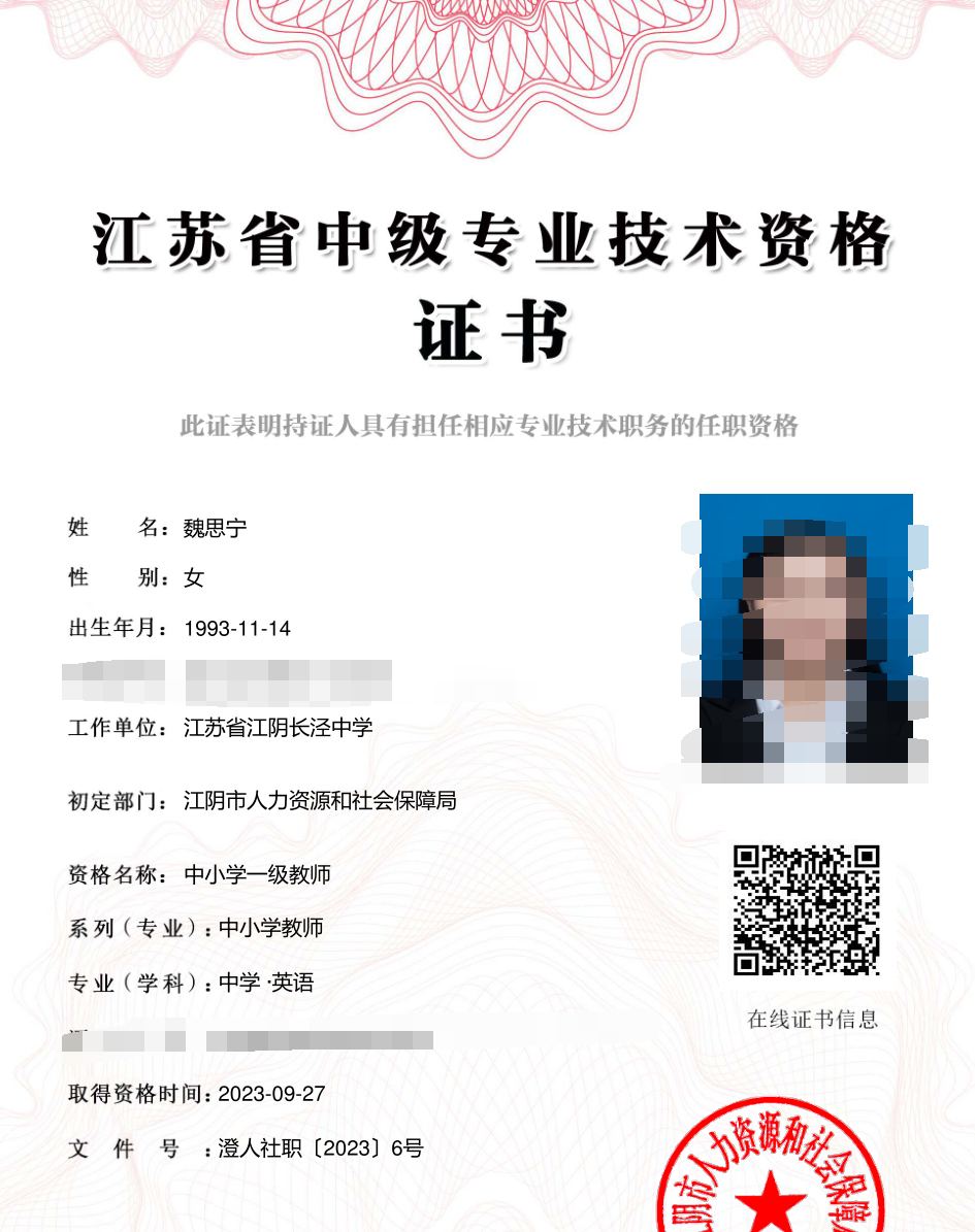 魏思宁和赵芝萍老师于2023年9月份获得中小学一级教师职称
