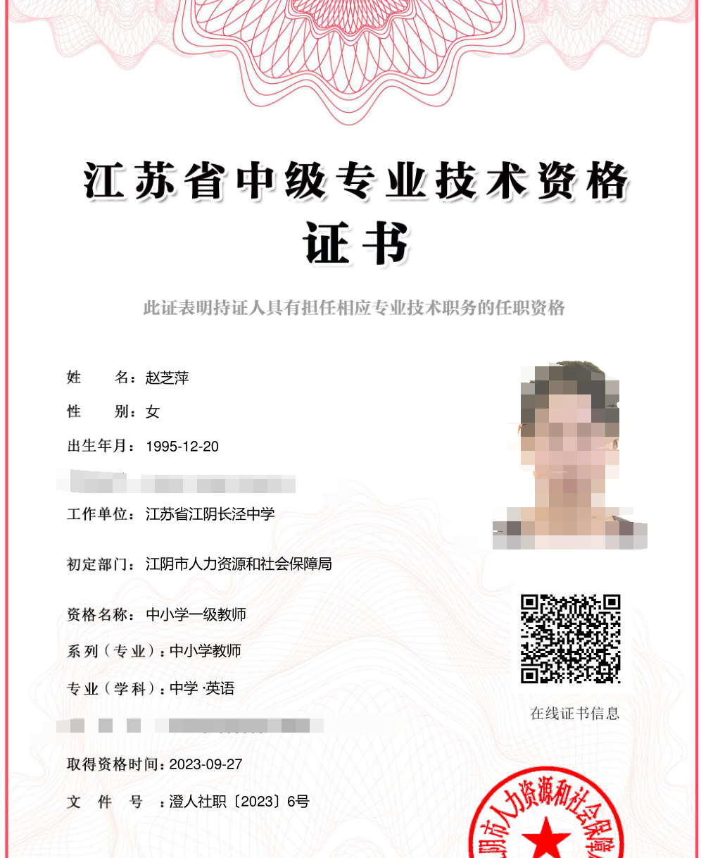 魏思宁和赵芝萍老师于2023年9月份获得中小学一级教师职称