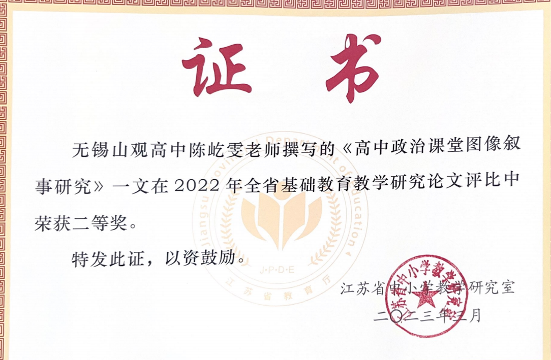 网站类目:研究成果获奖 姓名:陈屹雯 所在单位:江阴市山观高级中学 获奖类别:论文发表 获奖级别:省级 获奖等级: 获奖时间:2023-03-15 评比部门:江苏省中小学教学研究室 发表刊物: 刊物级别:省级 发表时间:2023-10-06