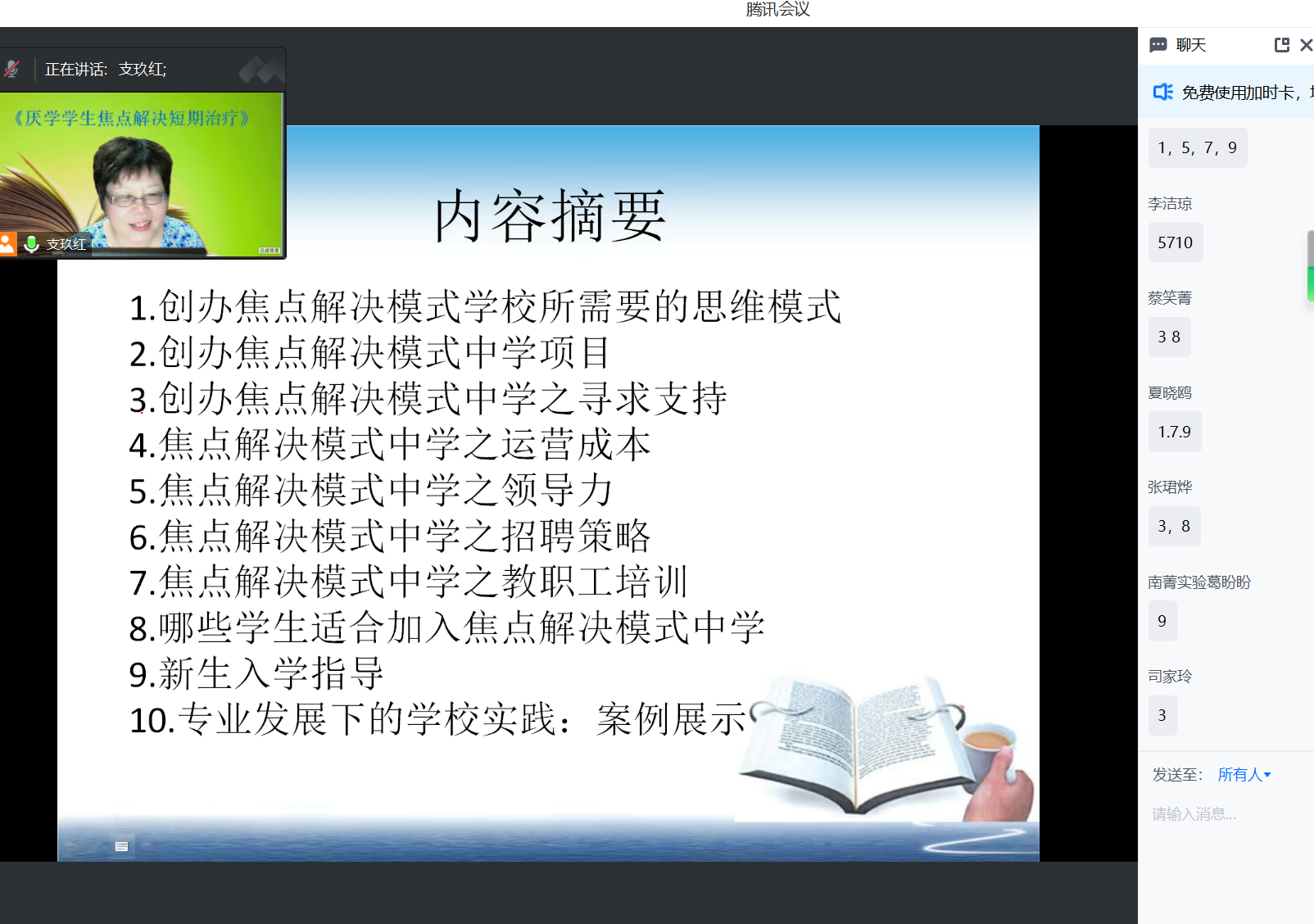 为提升心理教师的专业水平,在 6 月 30 日起,江阴市支玖红心理名师工作室开展了《厌学学生焦点解决短期治疗——预防辍学及助力学生成功之道》这本书的开展了4次线上读书交流会。