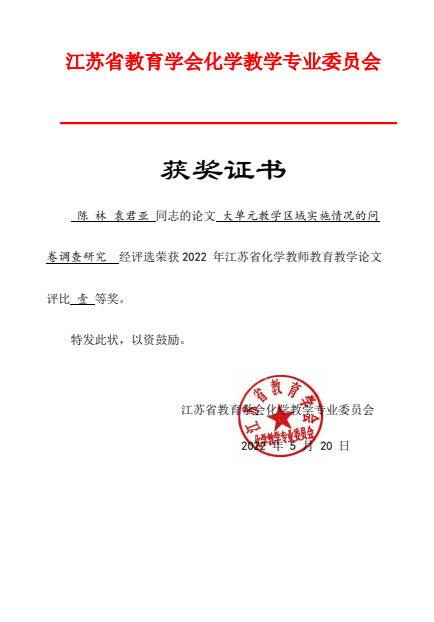 陈林 袁君亚论文《大单元教学区域实施情况的问卷调查研究》获省教育学会一等奖