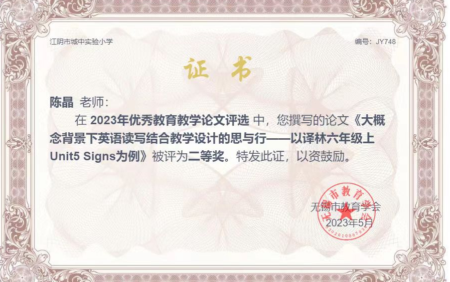 陈晶老师的论文无锡市获奖啦~~ 2023-10-06