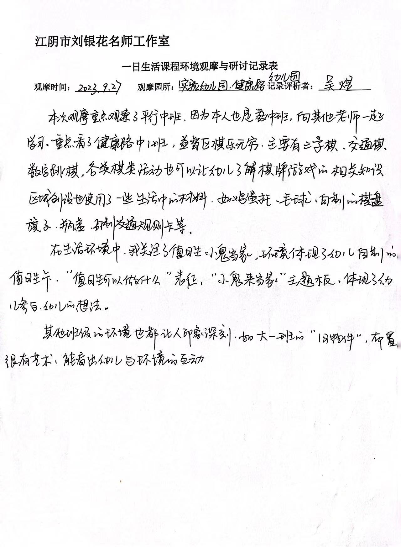 2023年9月27日区域观摩后,工作室成员们围绕区域的布局及环境、材料的投放、幼儿的游戏状态、教师的观察指导与支持等几方面进行研讨。教师对小、中、大区域游戏的亮点和不足进行交流讨论,并思考对本班级的借鉴、改进。