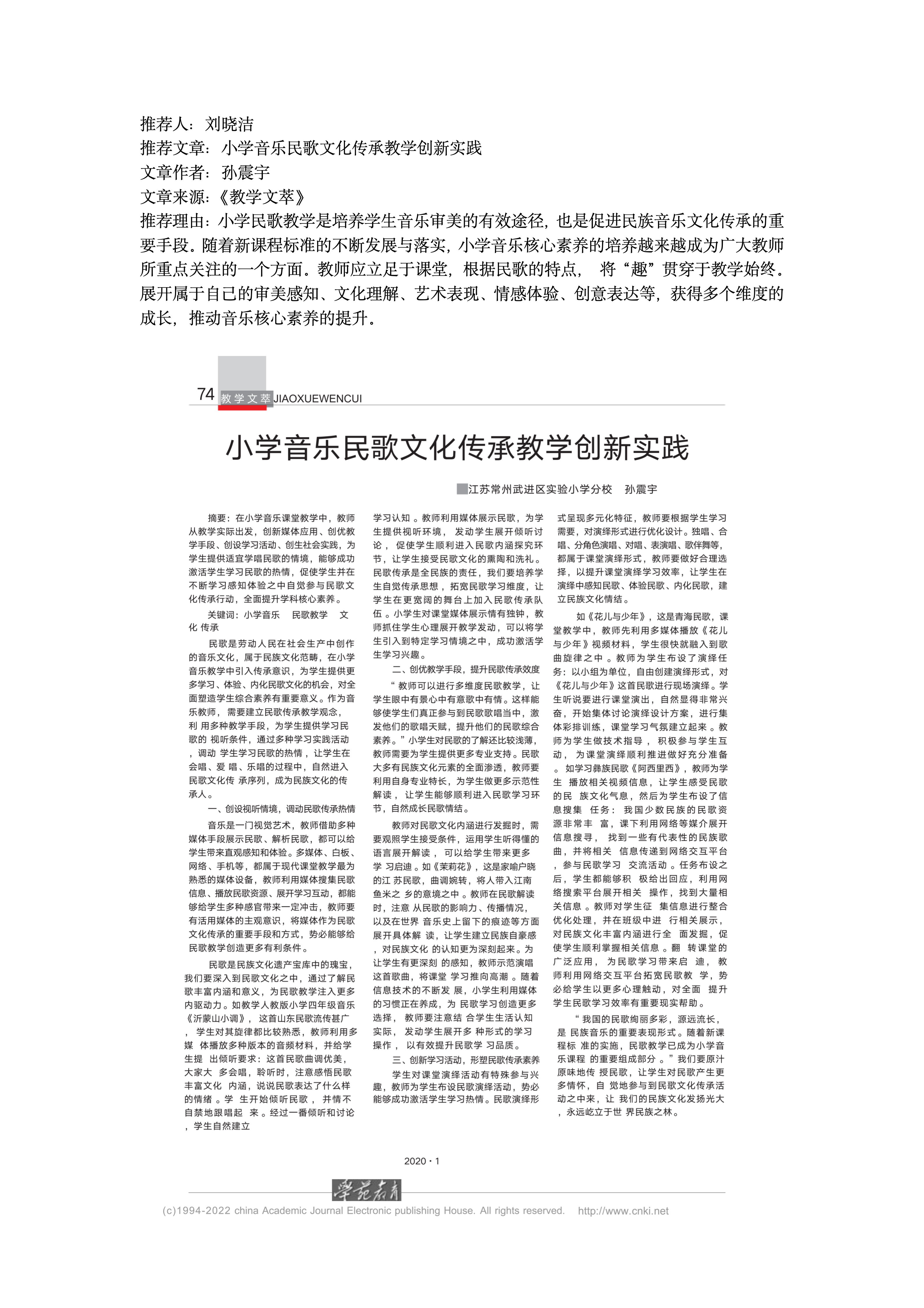 文章推荐:小学音乐民歌文化传承教学创新实践