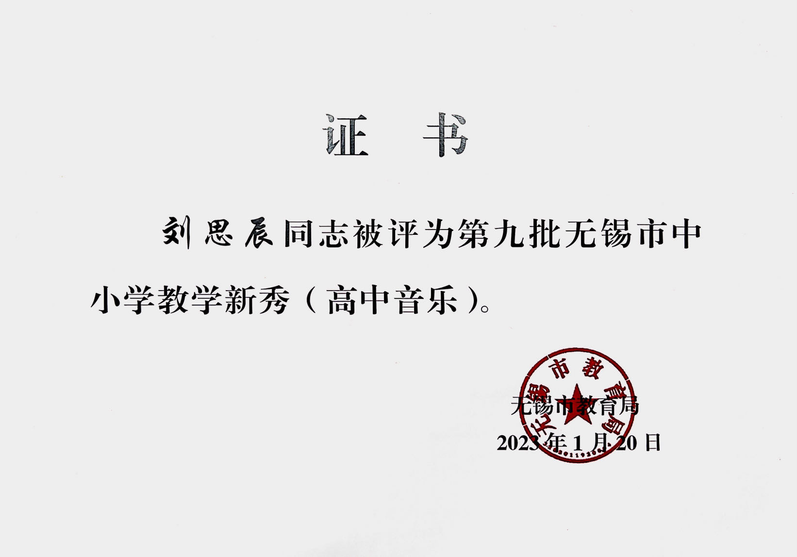 刘思辰老师被评为第九批无锡市中小学教学新秀(高中音乐)