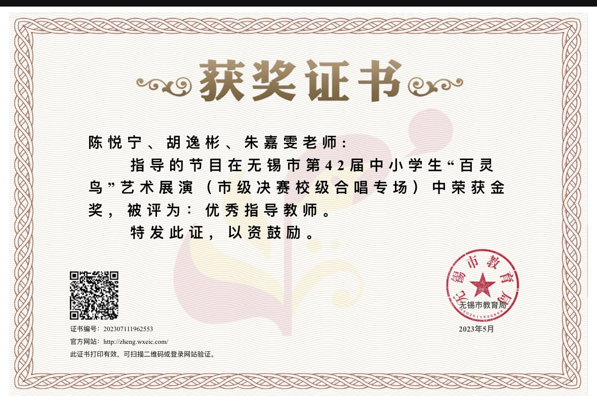 陈悦宁指导节目获无锡市百灵鸟合唱金奖