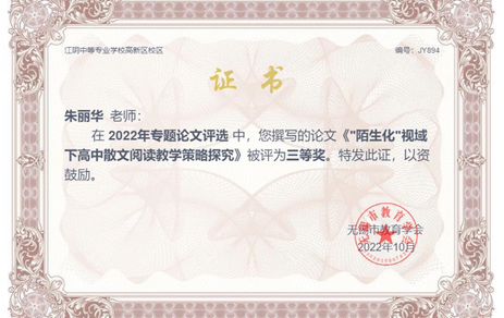 季春花工作室成员朱丽华老师获无锡市教育学会论文三等奖
