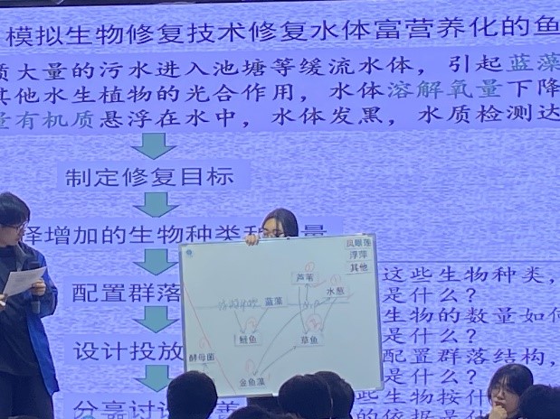 另外,王红梅老师和卓芳芳老师展示的主题为《生态系统通过自我调节维持稳态》单元教学课,让我大开眼界。两位老师从“西溪”这一主题出发,围绕对“生态瓶”这一微型生态系统模型分析,引导学生分析“西溪”部分生态系统失衡和维持稳定的原因,并结合资料引导学生分析修复“西溪”生态系统的可行、科学、高效的措施。这节课的以下几处给我留下深刻影响: