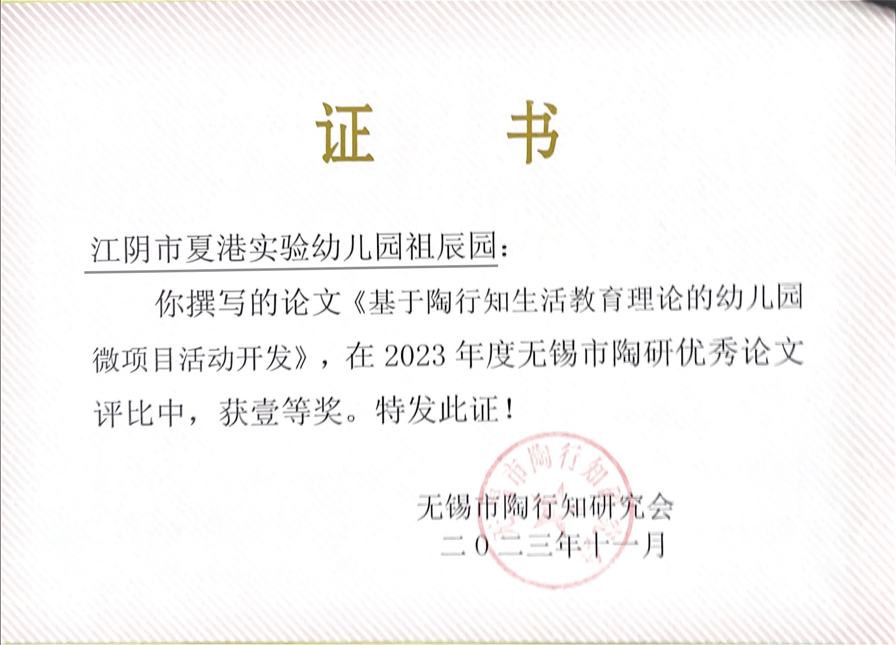 祖辰园老师《基于陶行知生活教育理论的幼儿园微项目活动开发》获无锡市一等奖