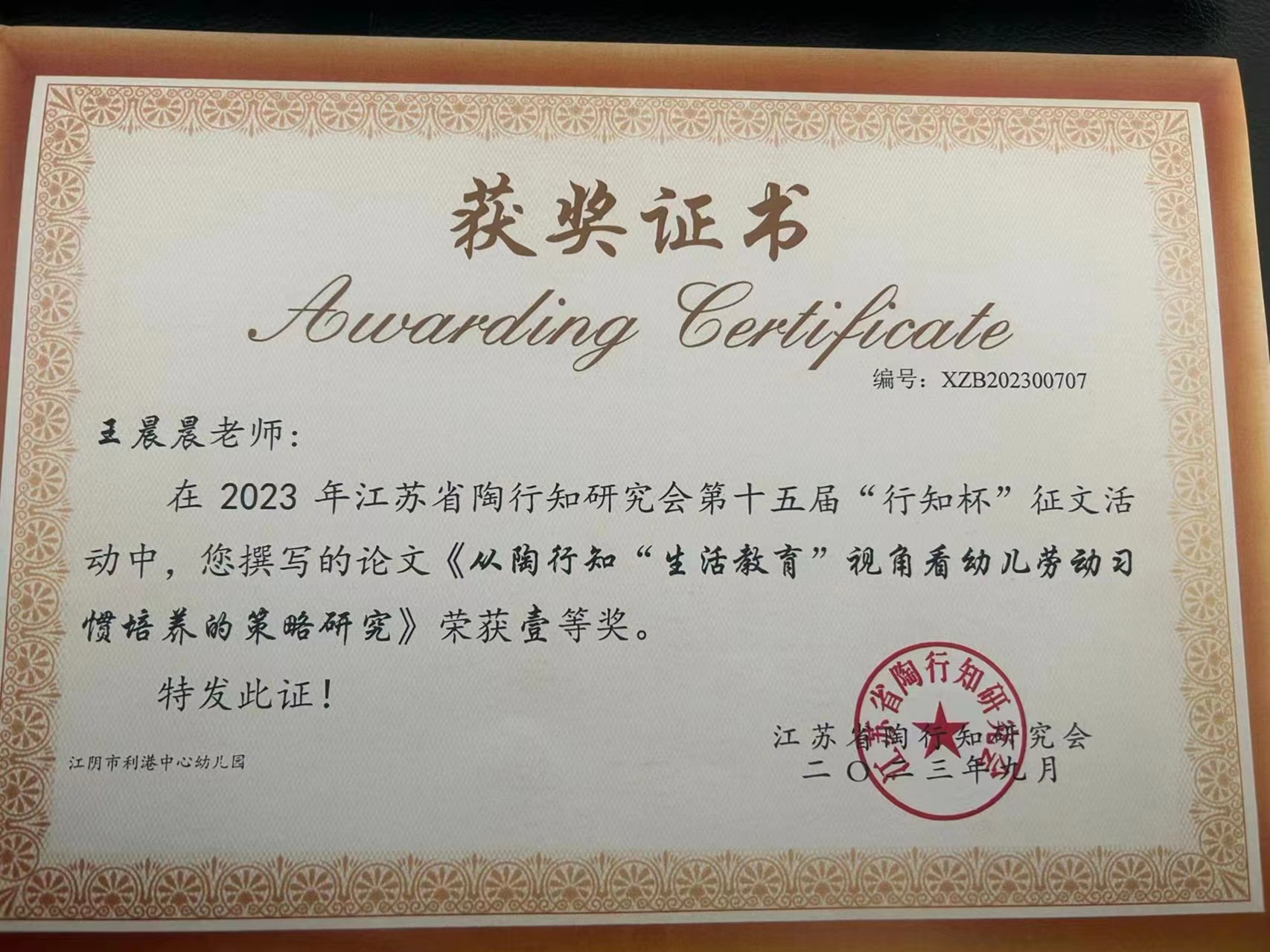 王晨晨老师《从陶行知“生活教育”视角看幼儿劳动习惯培养的策略研究》获江苏省一等奖 2023-12-20