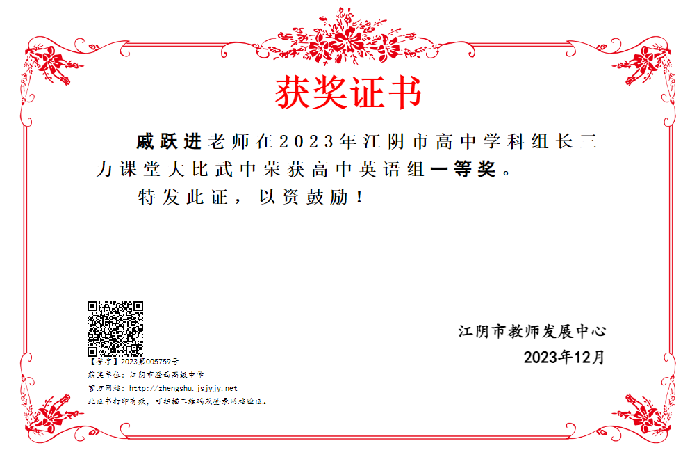 2023年江阴市高中学科组长“三力课堂”教学大比武活动市级课堂教学大比武于11月底正式落下帷幕。在比赛中,我工作室成员戚跃进老师获得一等奖,特此祝贺!