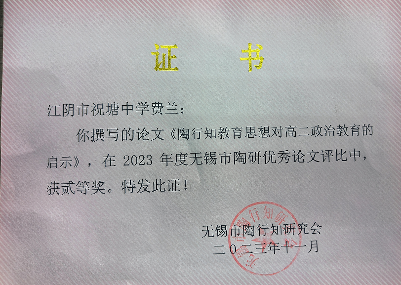 网站类目:研究成果获奖 姓名:费兰 所在单位:江阴市祝塘中学 获奖类别:论文比赛 获奖级别:市级 获奖等级: 获奖时间:2024-04-18 评比部门:无锡市陶行知研究会 发表刊物: 刊物级别:市级 发表时间:2024-04-18