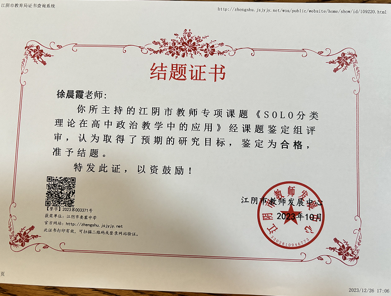 杨晓丽高中政治名师工作室成员徐晨霞课题结题 2024-04-19