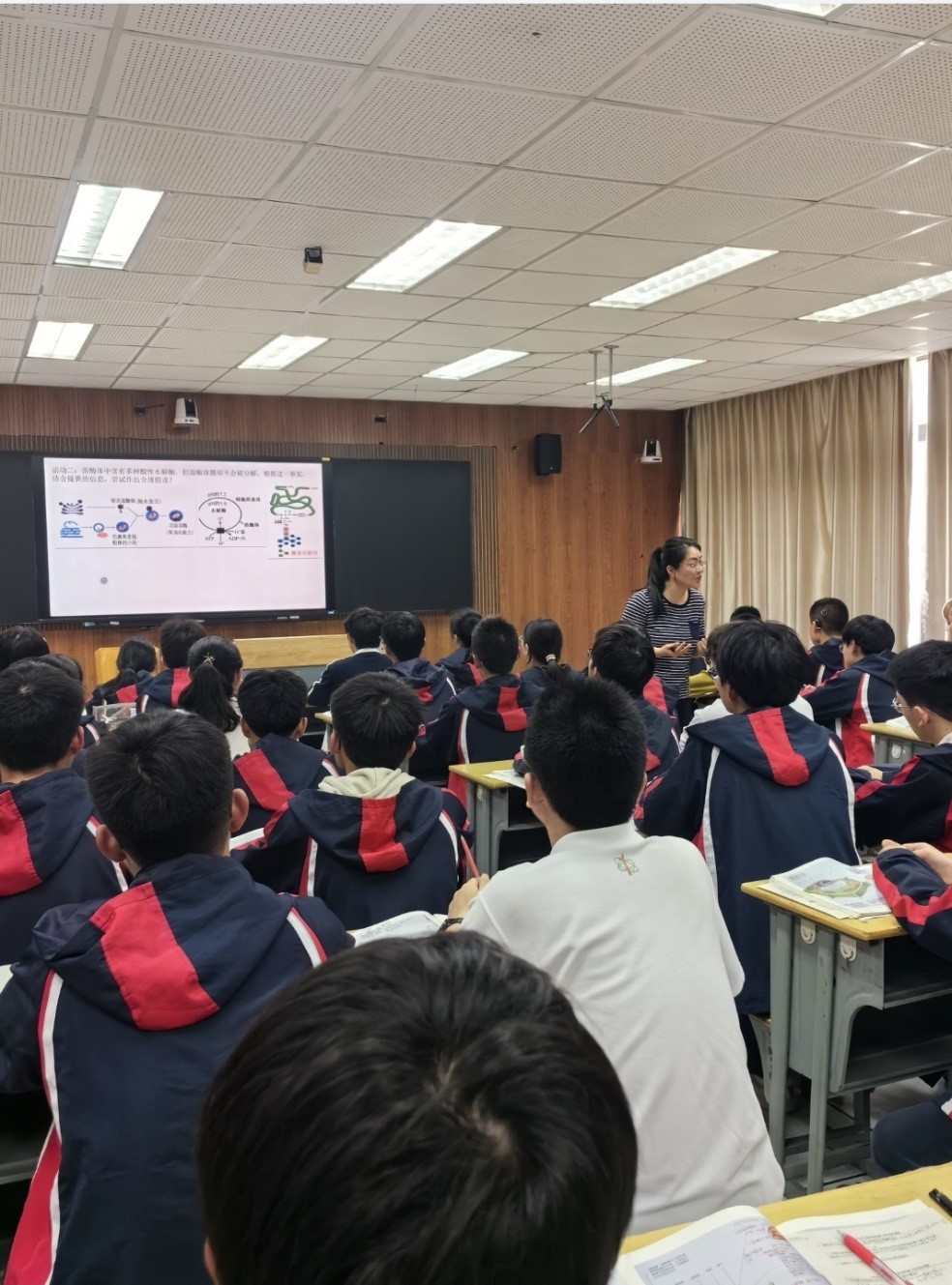本次活动的第一节课是由崔敏霞名师工作室的陶刚琴老师开设的一轮复习课《细胞器之间的分工合作》。陶老师的课以指向循证思维培养为目的,通过具体情境下的问题帮助学生深刻理解教材中概念的本质,同时将培养学生生物学学科素养。例如,通过案例分析引导学生强化“结构与功能相适应”的生命观,并应用这一观点解释真实问题;通过引导学生从信息中获取内共生学说的证据、作出溶酶体不会被酶分解的假说、据图推理分析各种生物学事实发生的原因等途径发展科学思维。