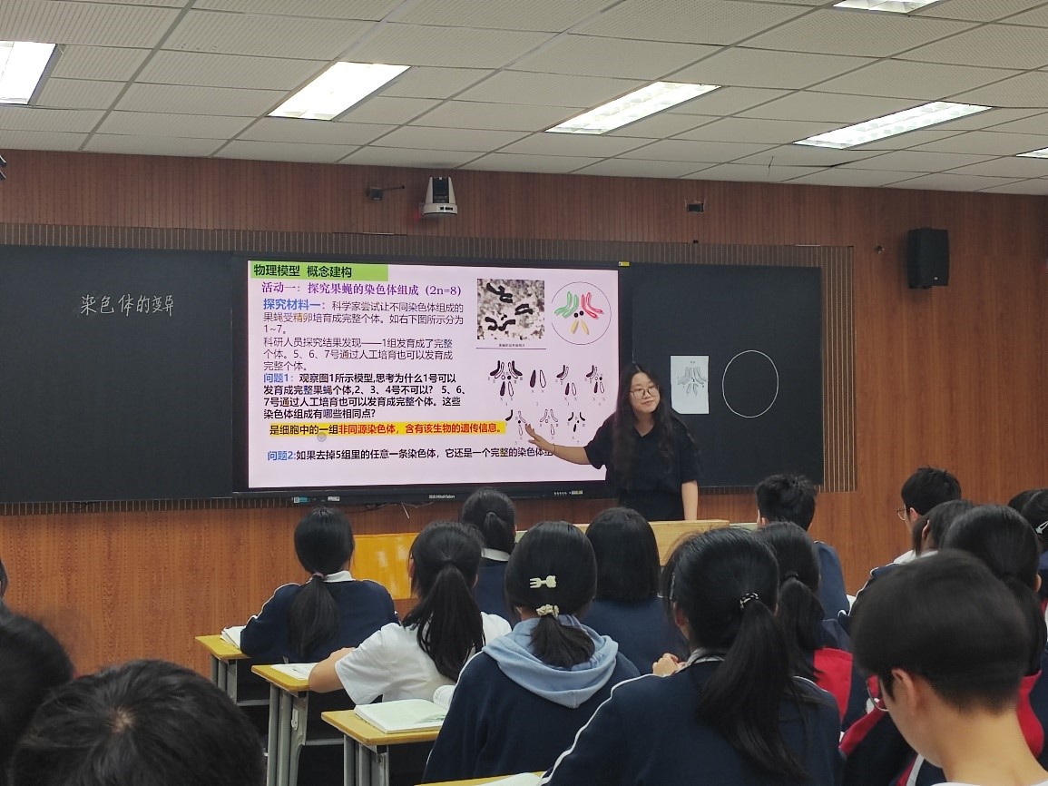第二节课是由徐建工作室的王紫芸老师开设的《染色体变异》。王老师虽然是一名青年教师,但有较扎实的教师基本功,台风稳重,亲和力强,语言简练,表达清晰。能结合生活中的实例,通过资料分析,采用概念教学的方法,带领学生层层深入理解概念。引导学生们分析多倍体的诱导因素、学生自主设计实验等发展学生的科学思维和科学探究能力。