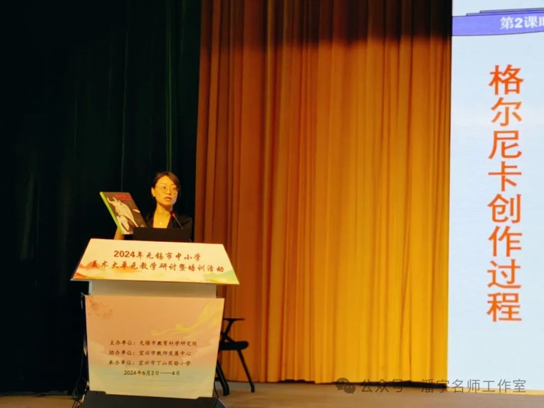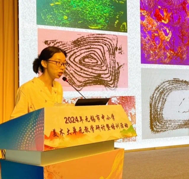 潘宇名师工作室成员周晓露老师和吴晓晴老师代表江阴美术教师团队参与了本次现场展示,他们经过前期精心准备,深挖教材、巧妙设计,为大家带来了高质量、高水平的大单元说课示范。