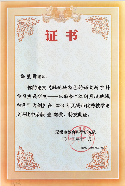 孙坚泽论文获无锡市一等奖