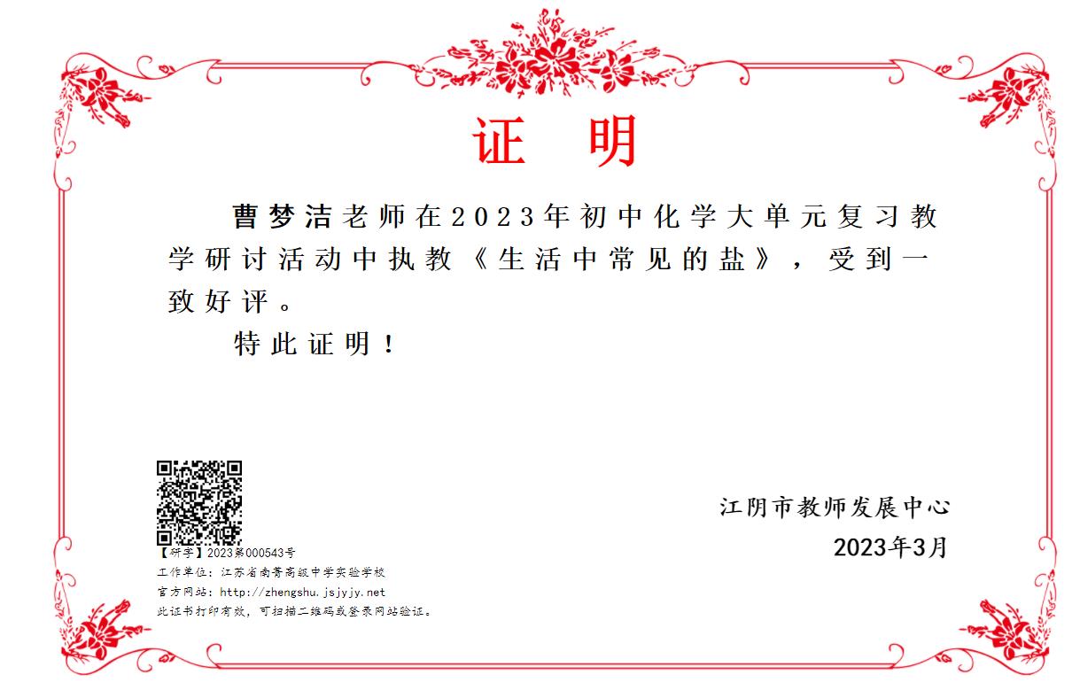 网站类目:教学设计 活动级别:县级 活动类别: 执教姓名:曹梦洁 所在单位:江阴市教育局 执教时间:2024-09-15 执教地点:江苏省南菁高级中学实验学校 执教内容:《生活中常见的盐》 参加对象: