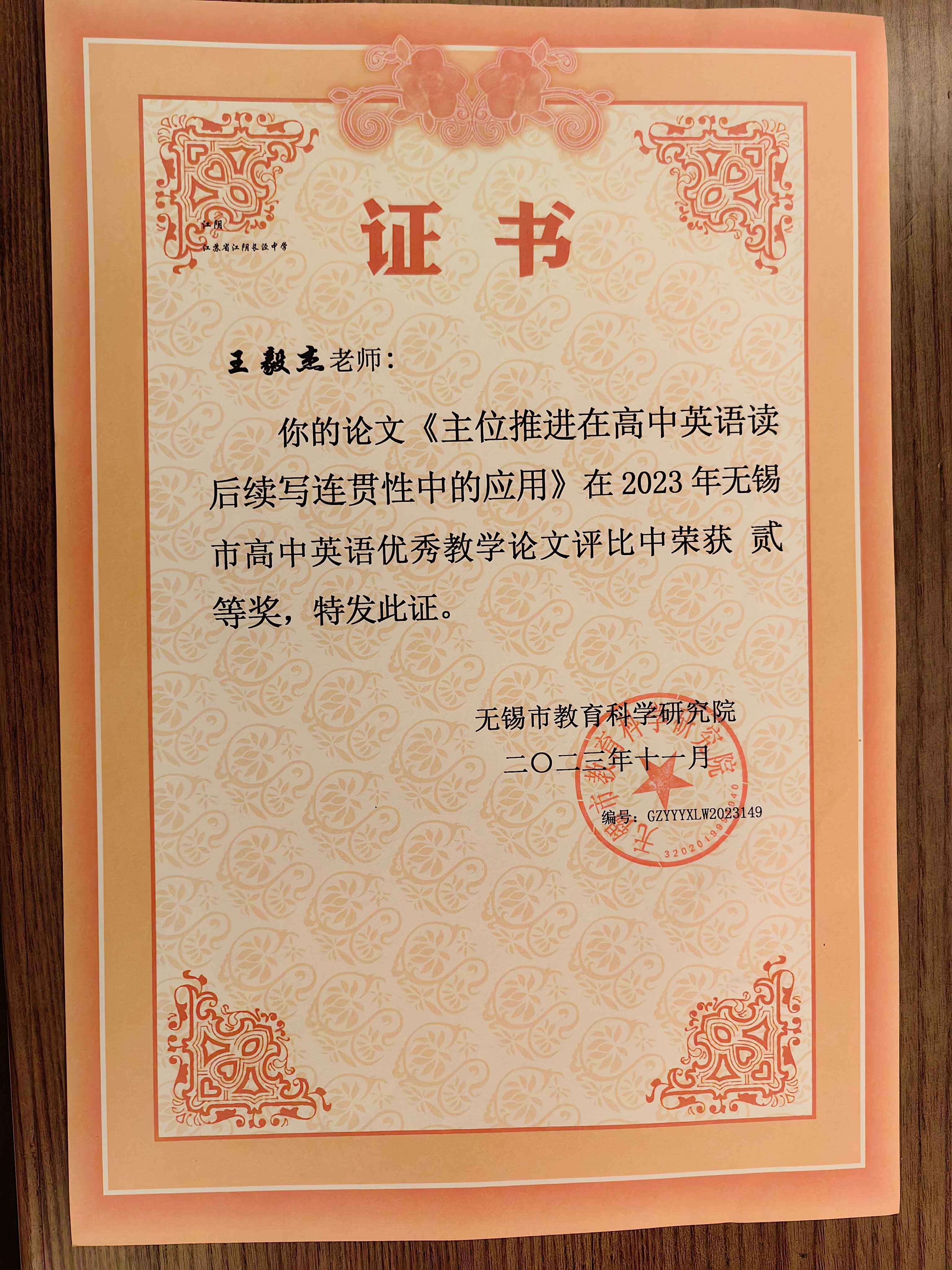 王毅杰老师获论文比赛一等奖