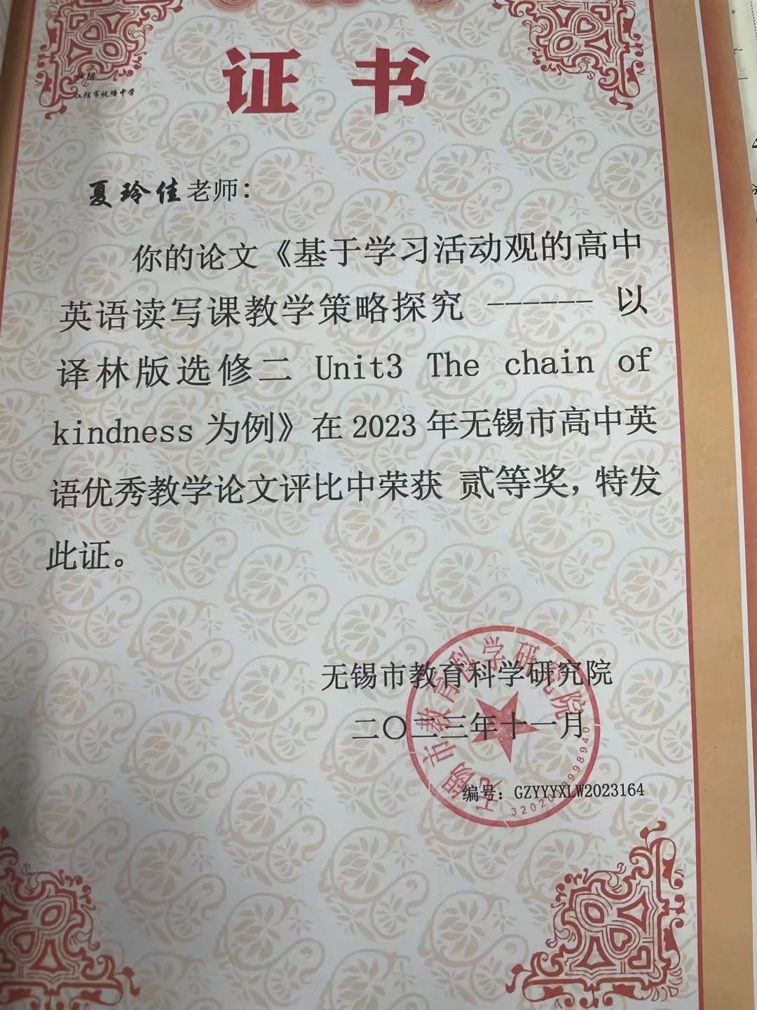 夏玲佳老师获论文比赛一等奖