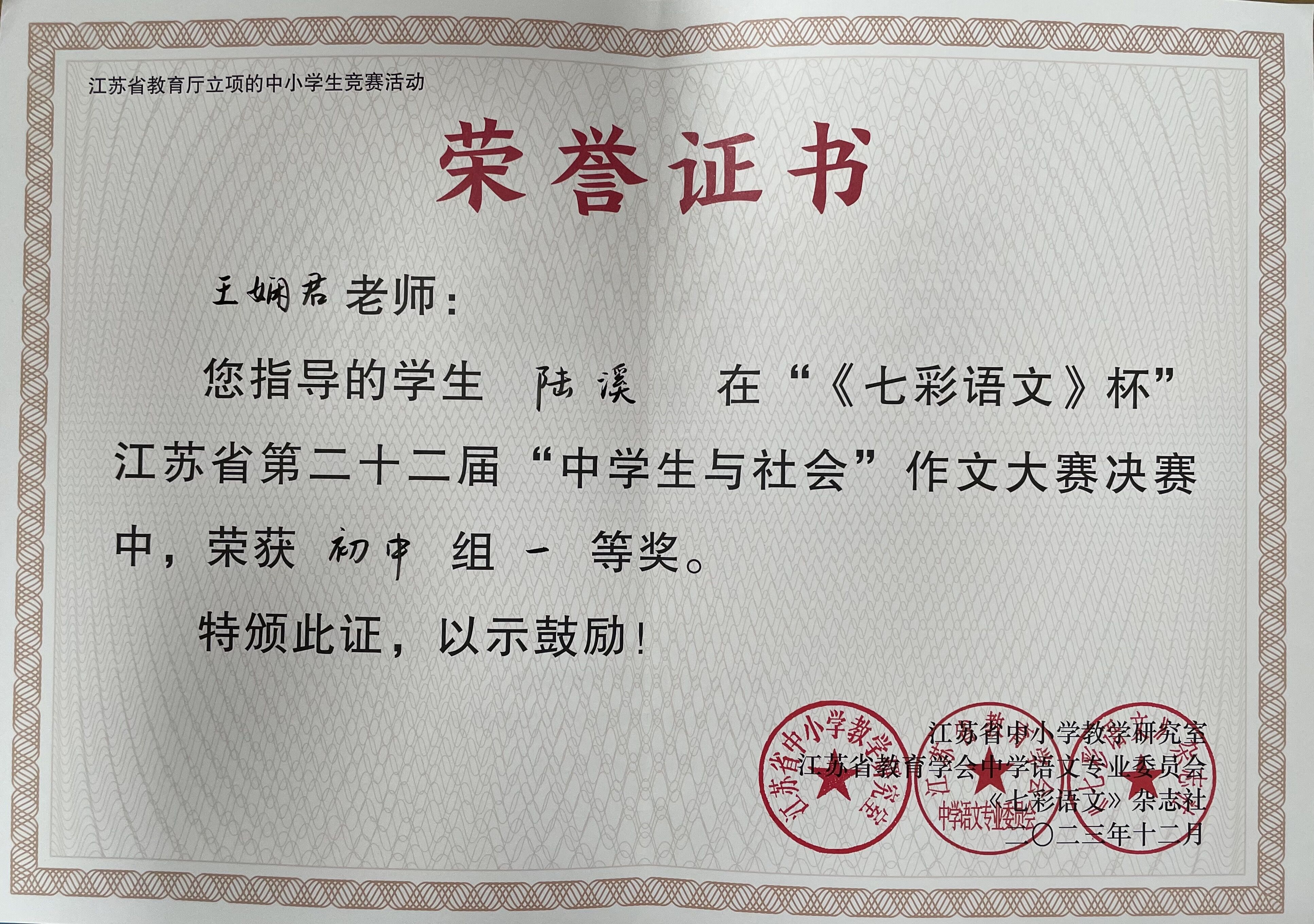 王娴君 学生陆溪作文省一等奖