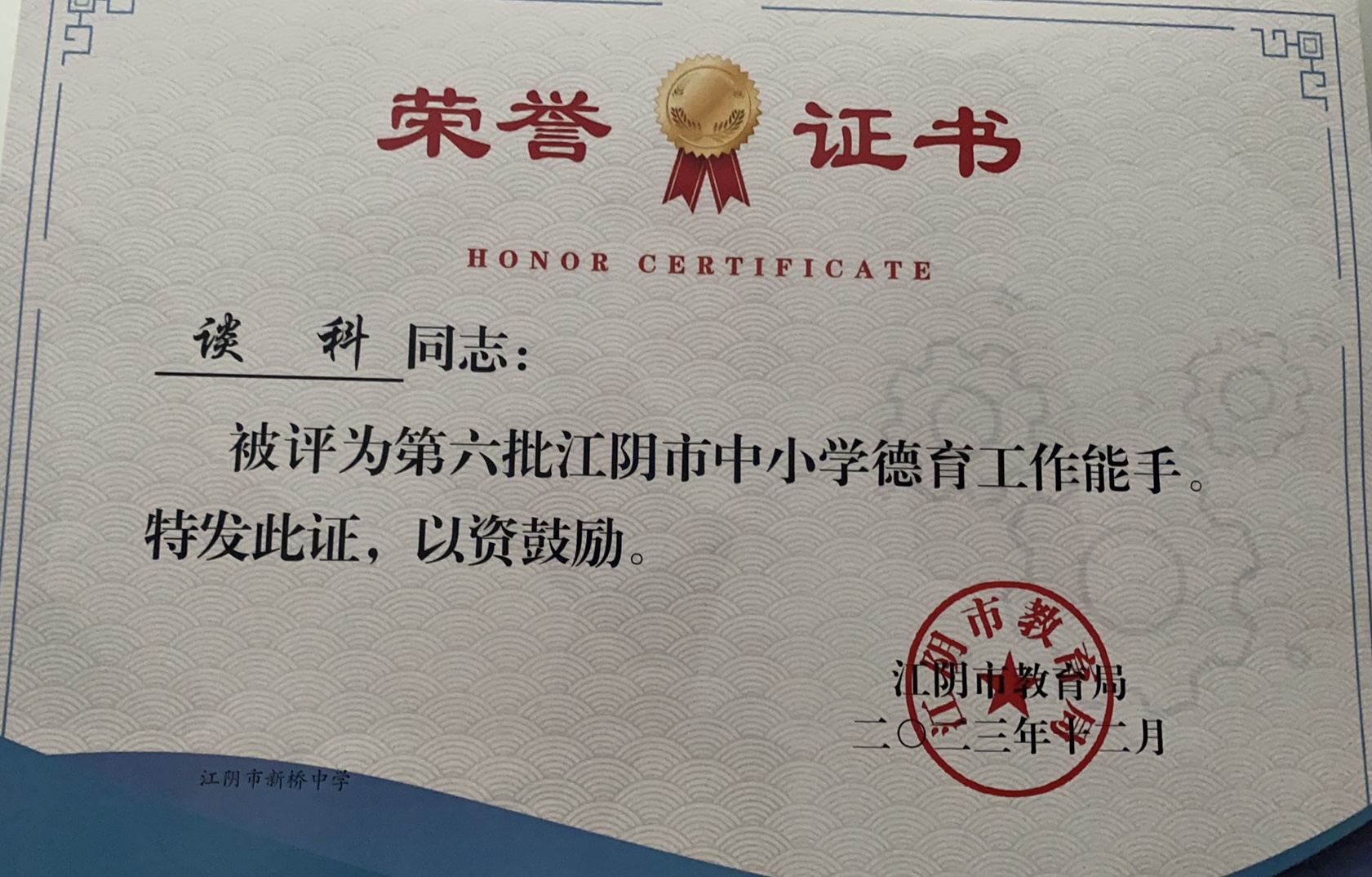 网站类目:荣誉提升情况 姓名:谈科 所在单位:江阴市新桥中学 荣誉类别:能手 荣誉级别:县级 获得时间:2023-12-21 评比部门: