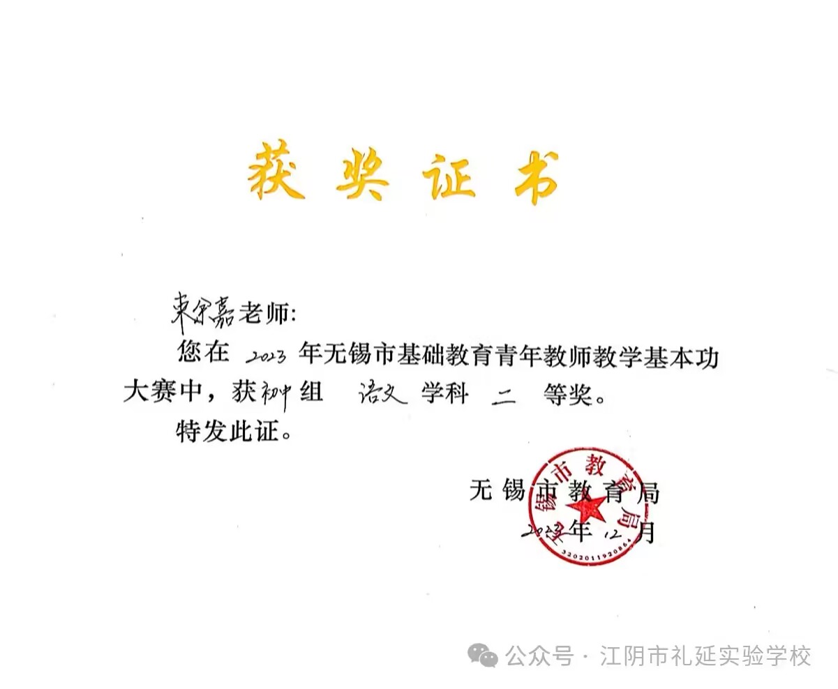 束余嘉无锡语文基本功大赛二等奖 2024-09-21