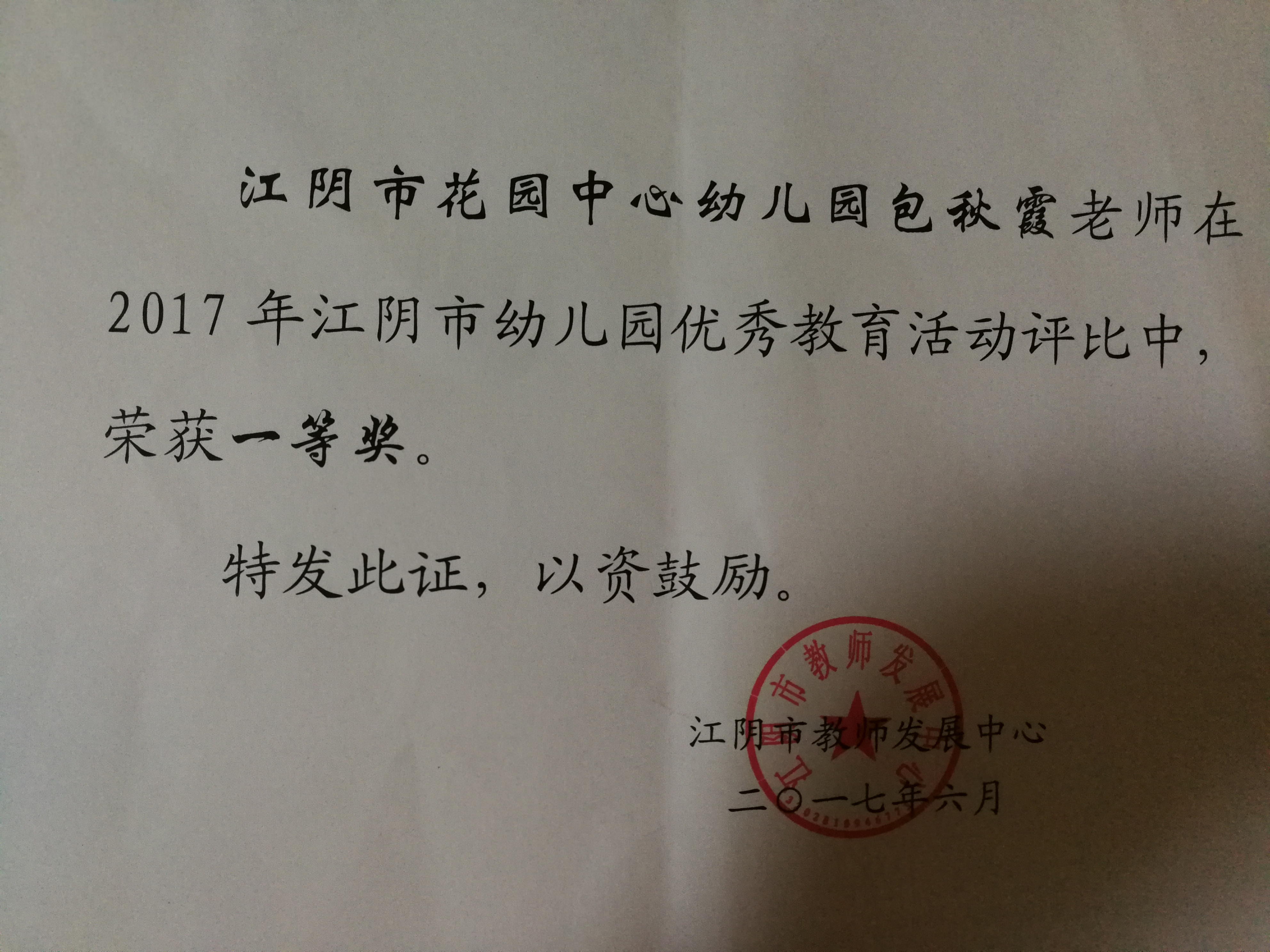 包秋霞老师在2017年幼儿园优秀教育活动评比中获一等奖