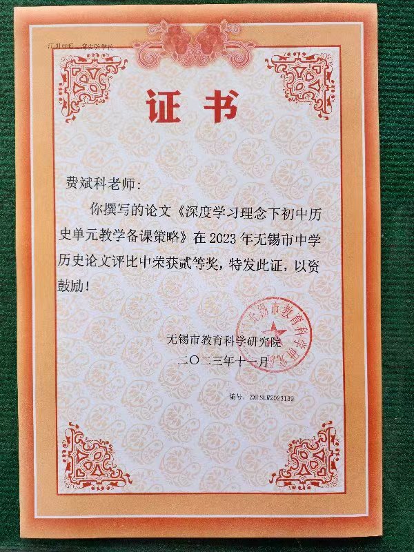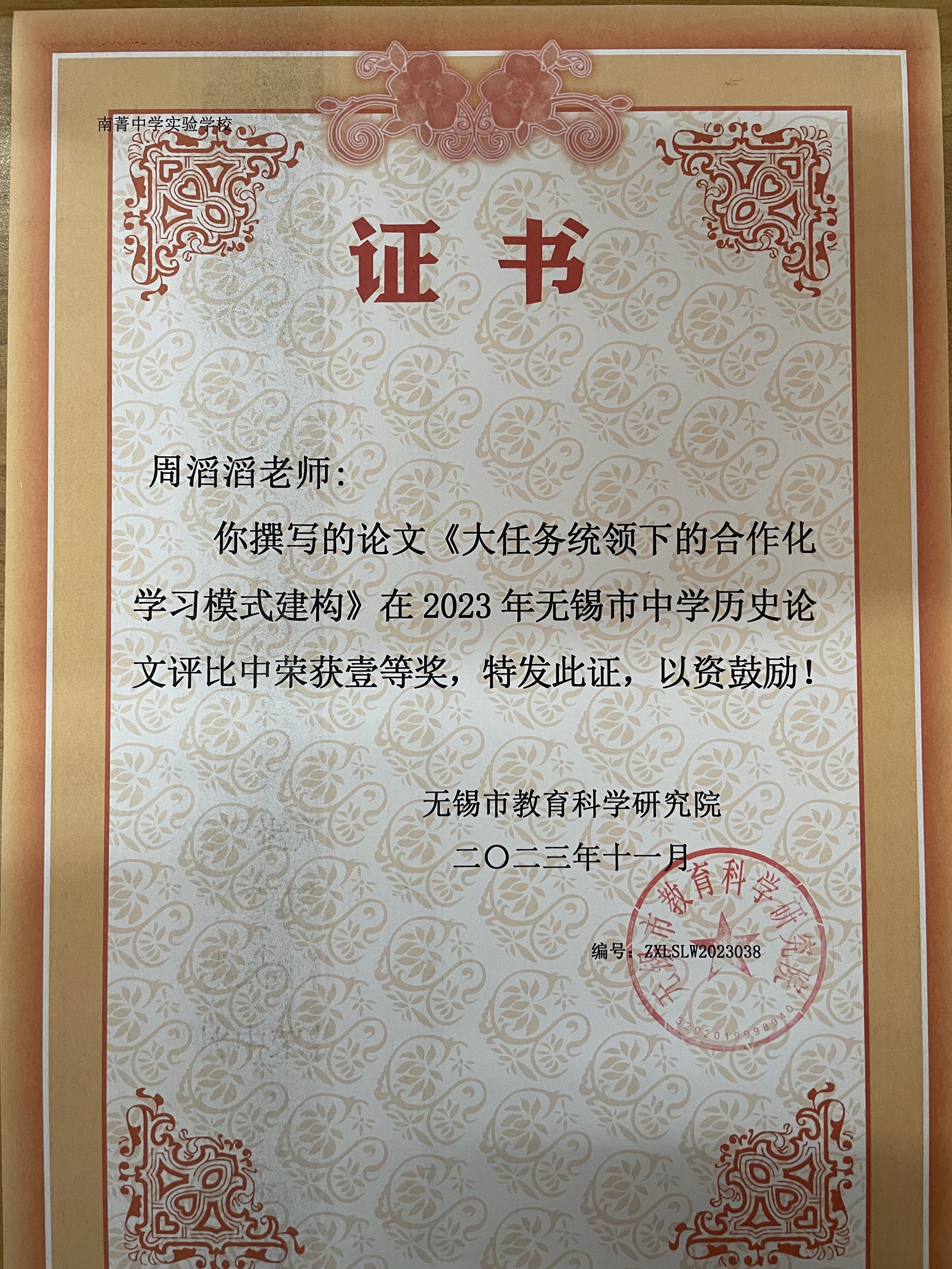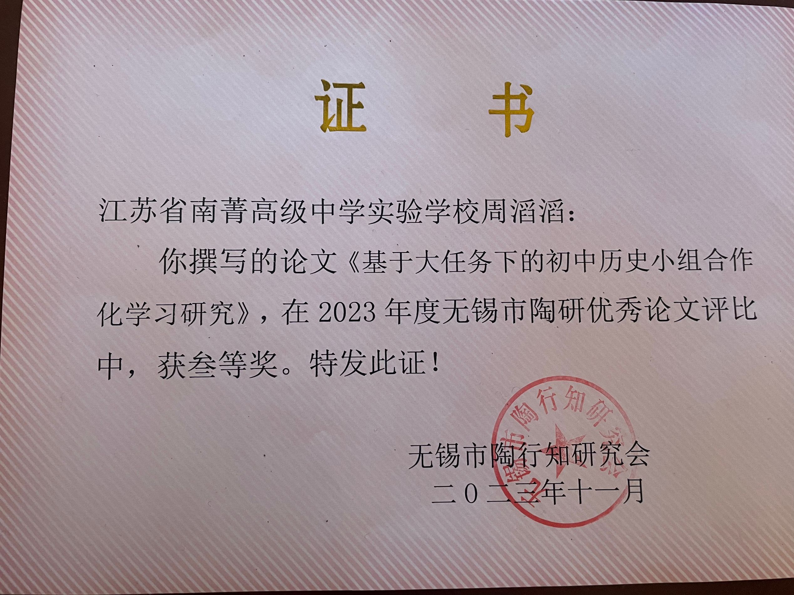 无锡市教科研论文一等奖《大任务统领下的初中历史合作学习策略研究》