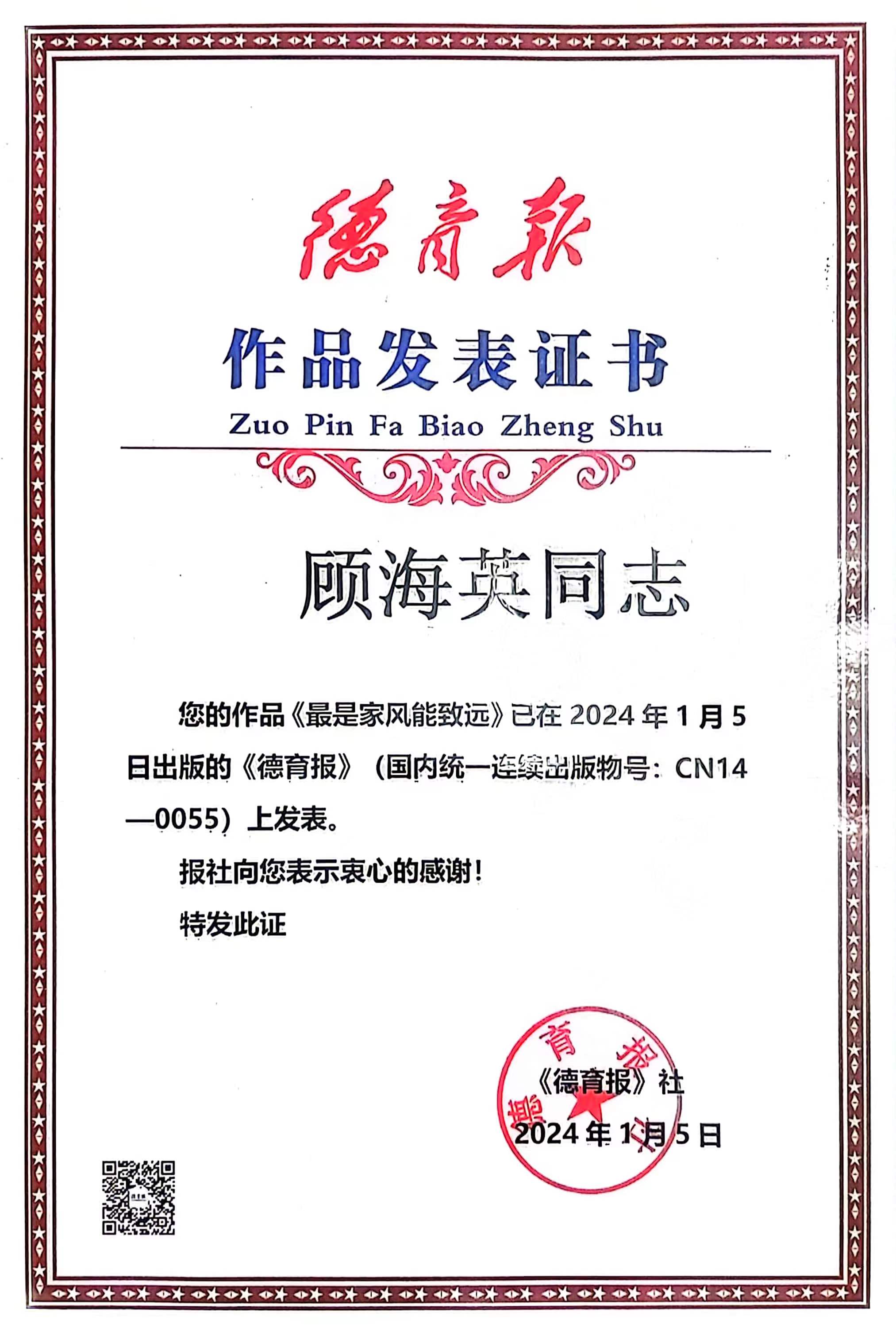 江阴市顾海英德育名师工作室——导师顾海英论文发表于《德育报》 2024-09-25