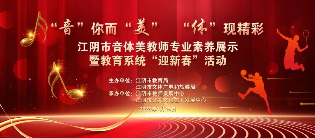 祥龙回首辞旧岁 金蛇起舞迎新春。在2025乙巳蛇年即将到来之际,2025年1月15日下午,由市教育局、市文体广电和旅游局联合主办,市教师发展中心、市公共文化艺术发展中心共同承办的江阴市音体美教师专业素养展示暨教育系统“迎新春”活动,在市公共文化艺术发展中心盛大举行。