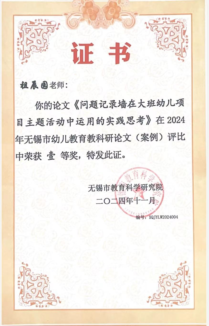 祖辰园老师的论文《问题记录墙在大班幼儿项目主题活动中运用的实践思考》获无锡市教育科研论文一等奖