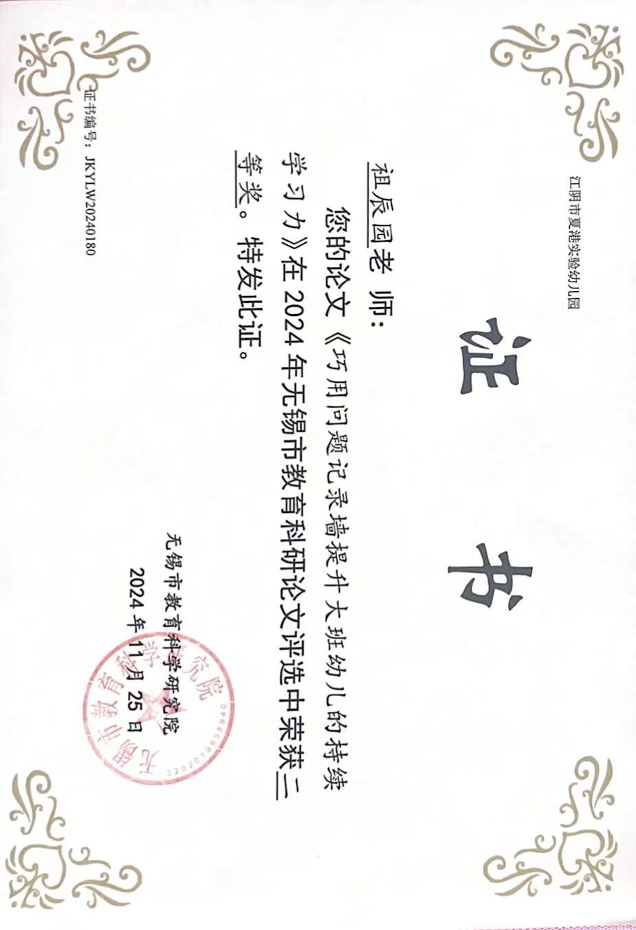 祖辰园老师的论文《巧用问题记录墙提升大班幼儿持续学习力》获无锡市教育科研论文评选二等奖
