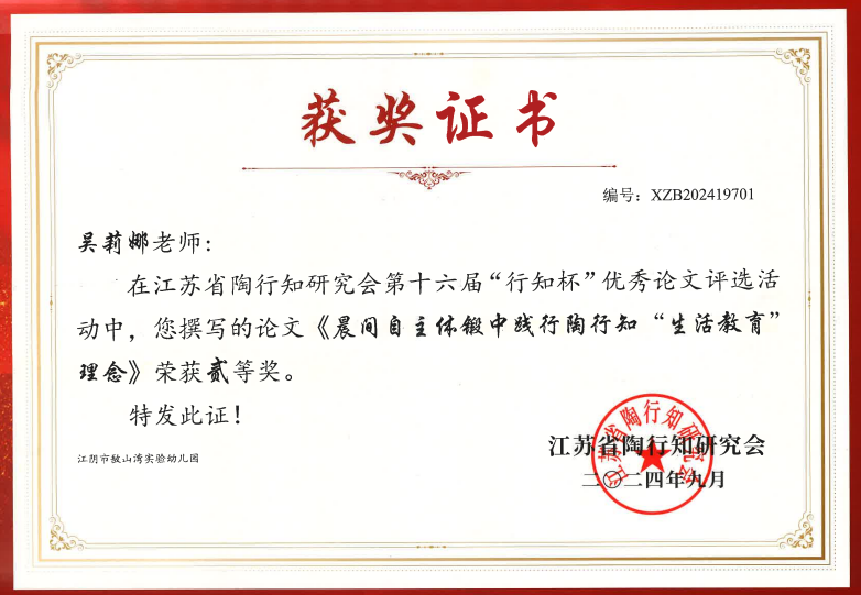 吴莉娜老师的论文《陈建自主体锻中践行陶行知“生活教育”理念》获江苏省二等奖 2025-08-19