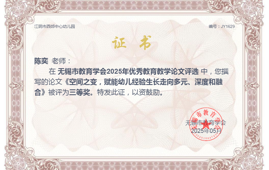 陈奕老师的论文《空间之变,赋能幼儿经验生长走向多元、深度和融合》获无锡市优秀教育教学论文评比三等奖