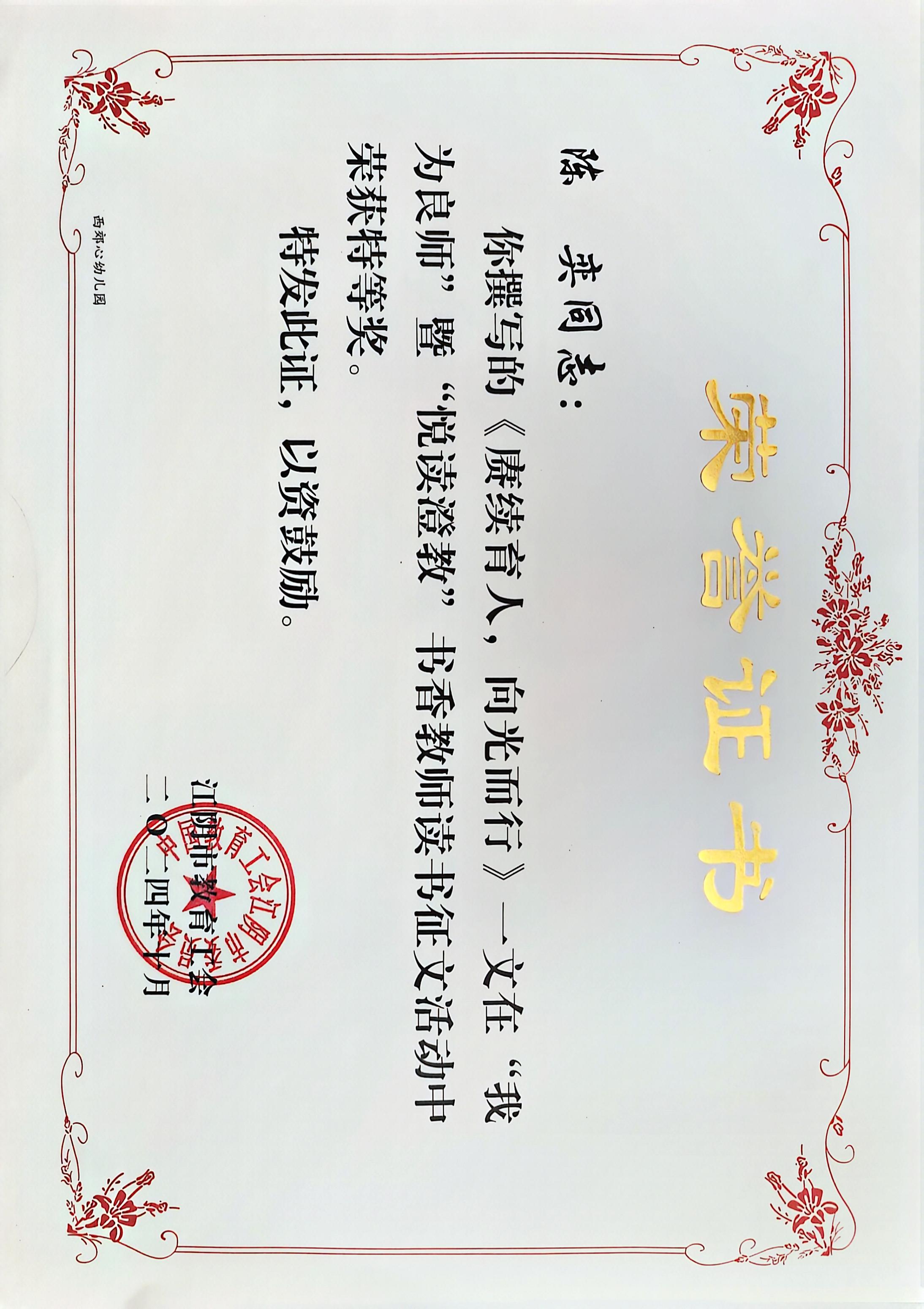 陈奕老师的《赓续育人,向光而行》一文在书香教师读书征文活动中获特等奖 2025-08-19