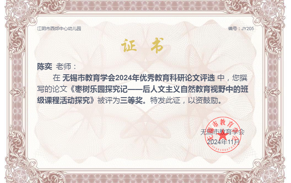 陈奕老师的论文《枣树乐园探究记》获无锡市教育学会优秀教育科研论文评选三等奖