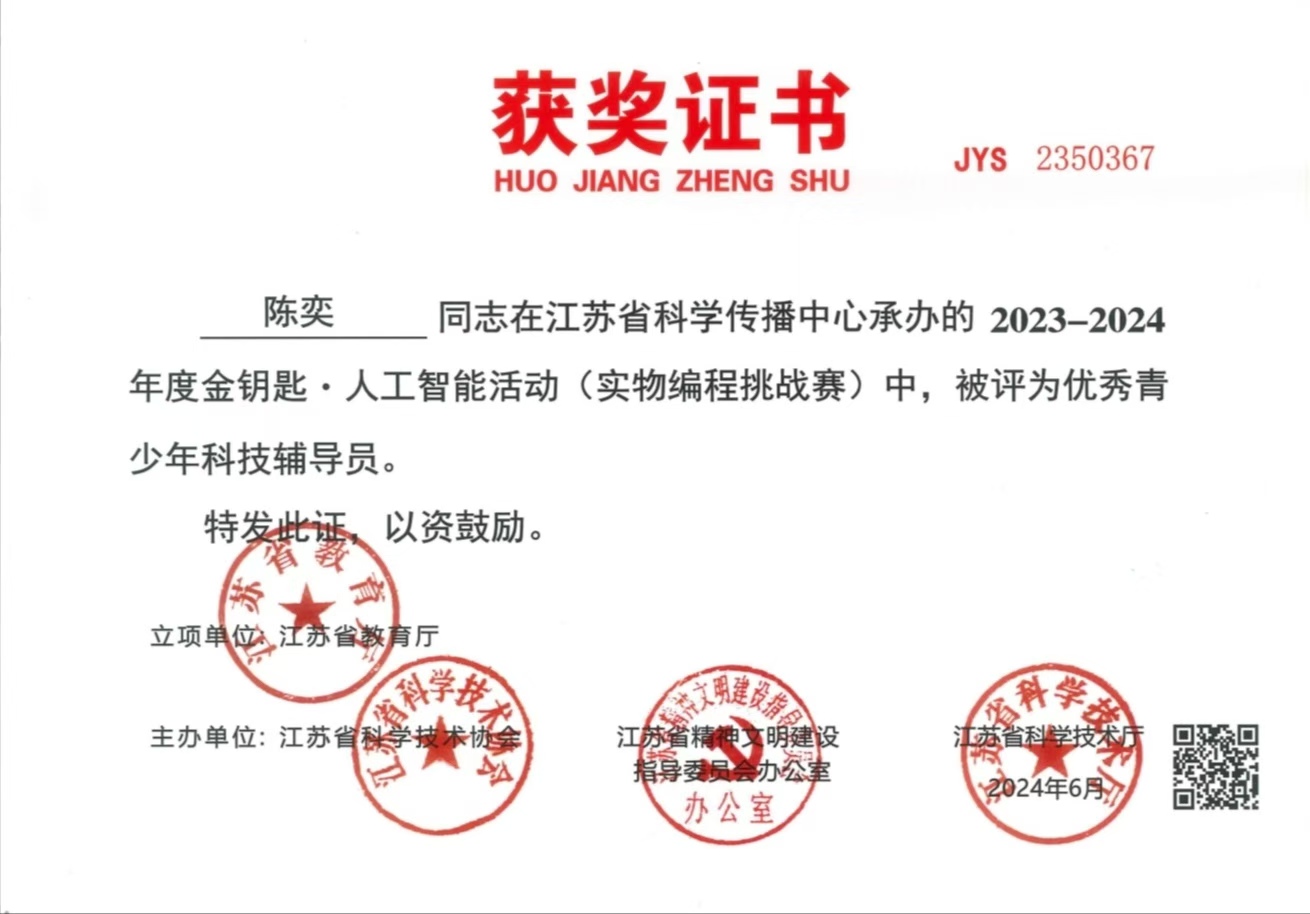 陈奕老师在江苏省科学传播中心承办的金钥匙·人工智能活动(实物编程挑战赛)中,被评为优秀青少年科技辅导员 2025-08-19