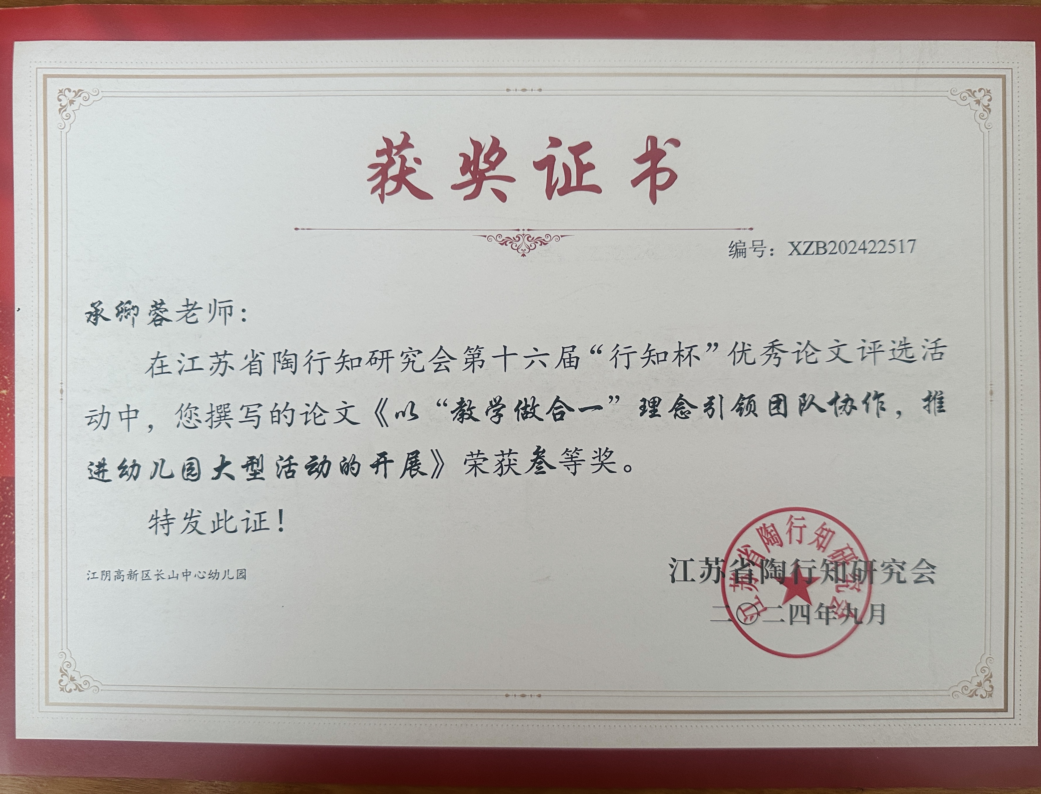 承卿蓉老师的论文《以“教学做合一”理念引领团队协作,推进幼儿园大型活动的开展》获江苏省三等奖 2025-08-19