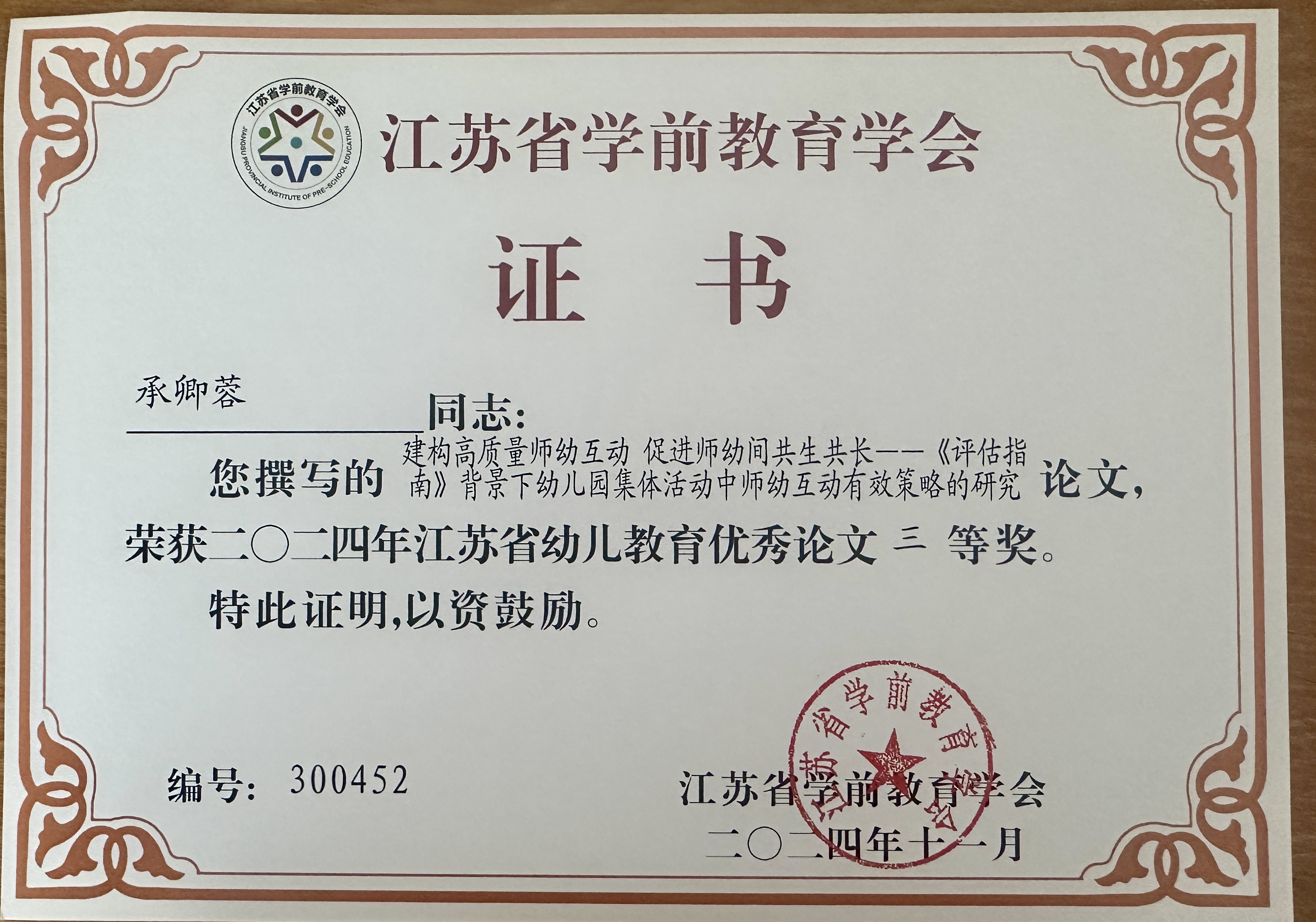 承卿蓉老师的论文《建构高质量师幼互动,促进师幼间共生共长》获江苏省幼儿教育优秀论文三等奖 2025-08-19